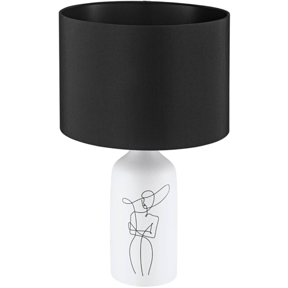 Lampe de table Vinoza - Coloris : Blanc et noir - Facile à allumer et éteindre via un interrupteur installé sur son câble - Dispose d'un abat-jour rond en tissu noir et une base en céramique blanche avec une silhouette féminine dessus - S'intègre avec style dans la chambre sur la table à chevet, dans le salon sur le rebord de la fenêtre ou dans le hall d'entrée sur le buffet - Convient à toutes les ampoules à culot E27 maximum 40 watts - Dimensions : 53.5 et 30 cm de Ø diamètre.