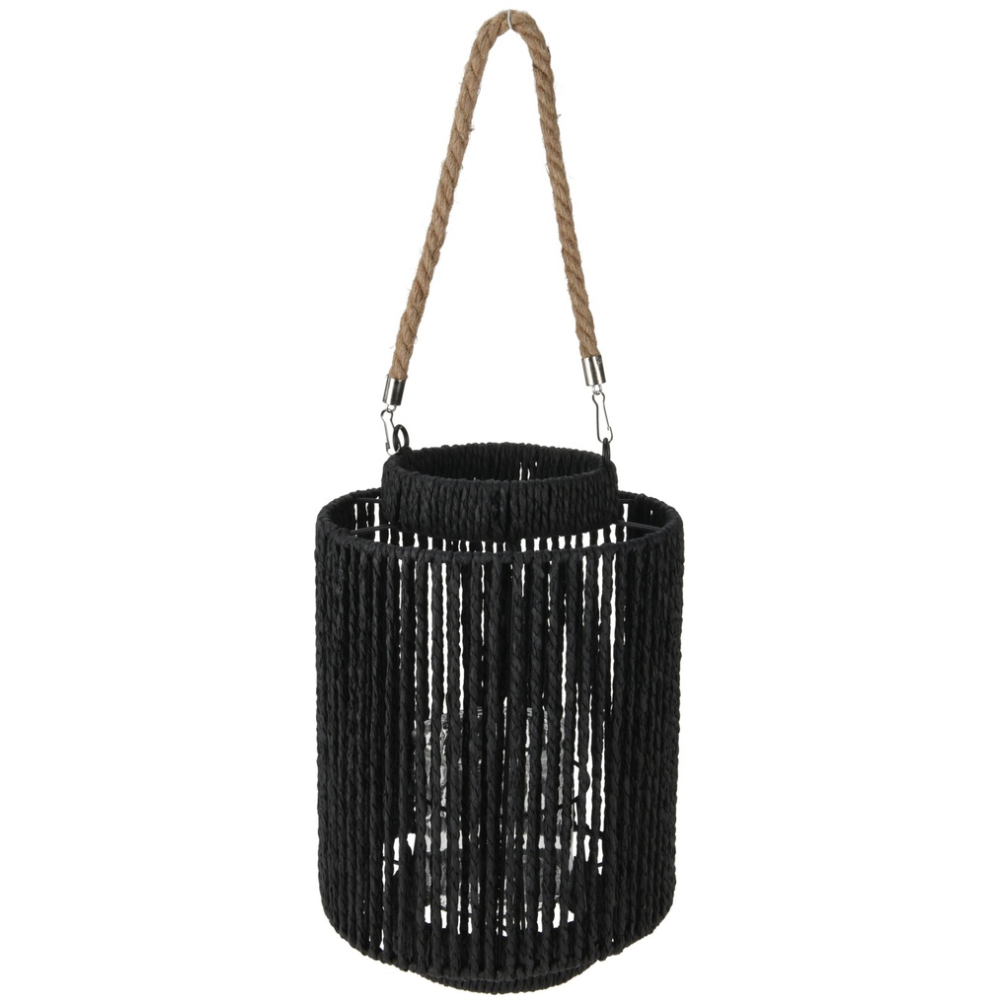 Lanterne originale de couleur noire - Composée d’un tissage de lianes noires montées sur un cadre métallique - Mesure 32 cm de haut et 22 cm de diamètre - Présente un design à 2 niveaux qui offre un excellent reflet des rayons de lumière - Intègre un porte-bougie sous forme de contenant ouvert qui assure à la fois la stabilité de la bougie et protège la flamme contre le vent – Dispose d’une anse en liane facilitant son transport.