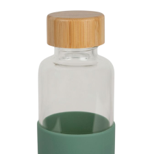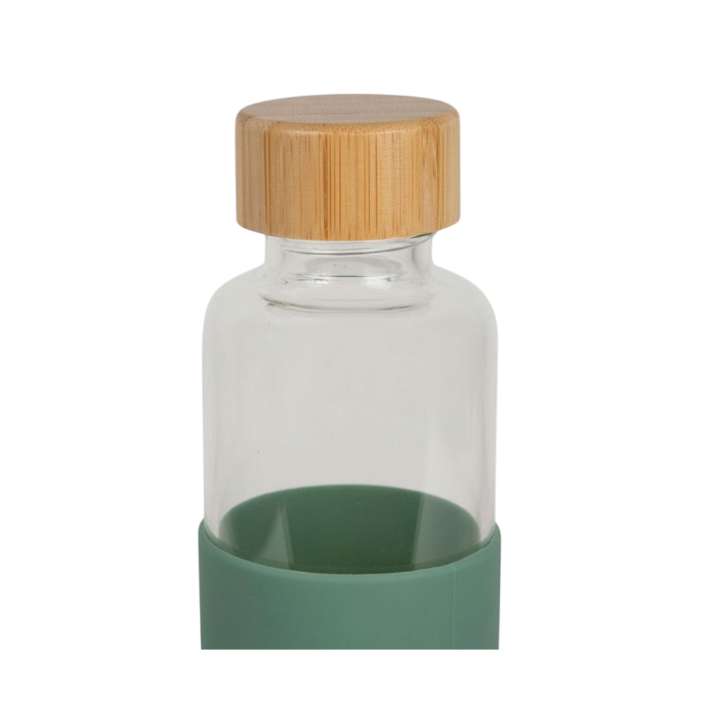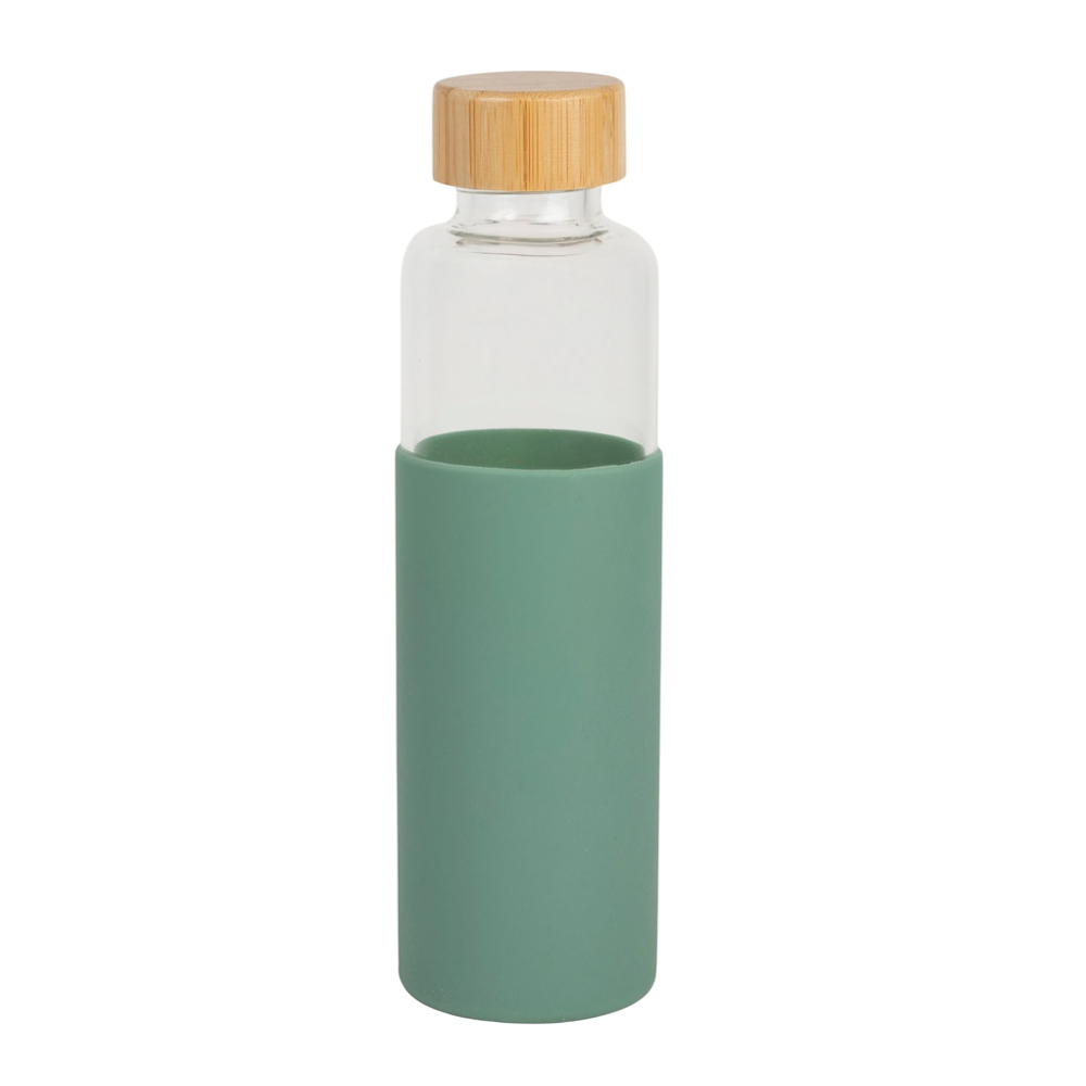 Gourde Vert d'eau 54cl en Verre Borosilicate. On aime le couvercle en bambou et le manchon protecteur en silicone vert menthe qui protège encore plus votre gourde verre et lui donne un touché ultra doux. Dimensions : 23.5 x 6.5 cm. Matière : Verre à haute teneur en borosilicate et manchon en silicone. Couvercle en bambou. Sans BPA.