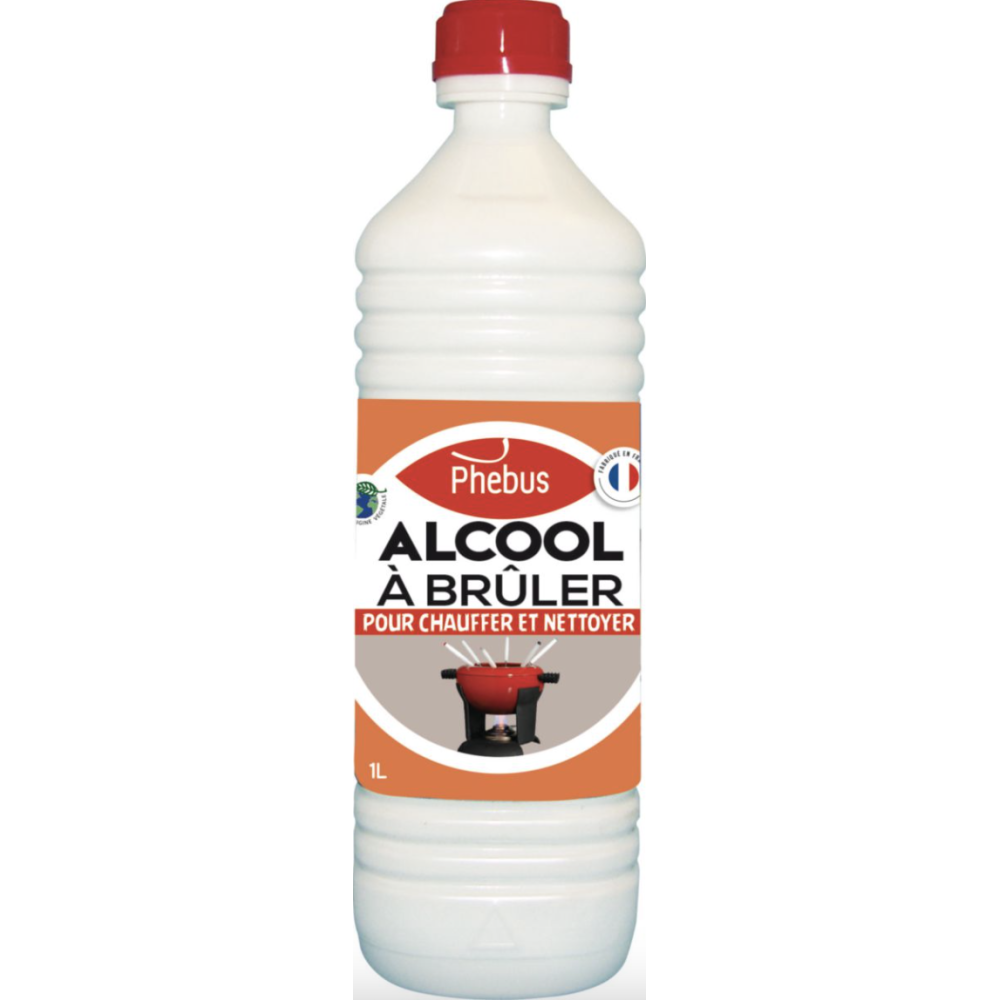 Alcool à brûler Phebus 1L 90° - Combustible pour poêlons à alcool - Nettoyant pour vitres, cristal, sols, murs, claviers d'écran - Détachant pour textiles (taches alimentaires, encre, feutre, stylo, cire, fruits, café) - Lustrant pour bronzes et ivoire - Nettoyant pour semelles de fer à repasser.
