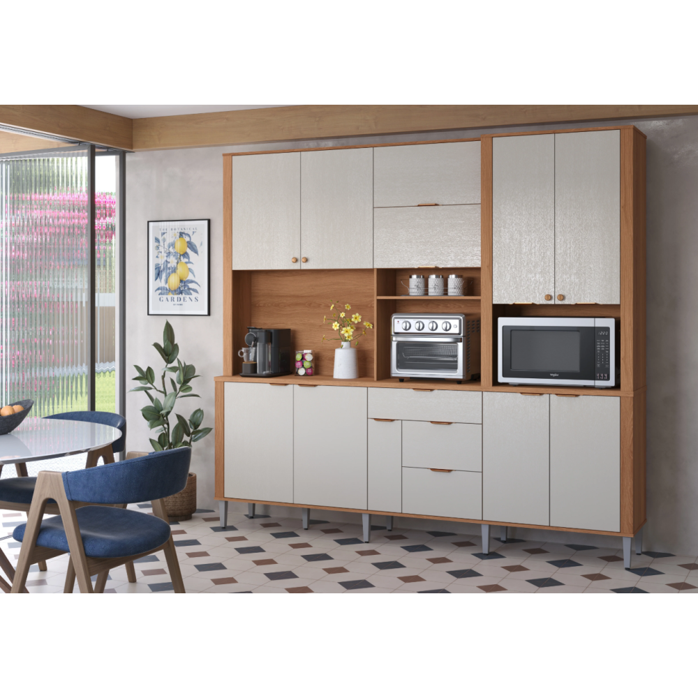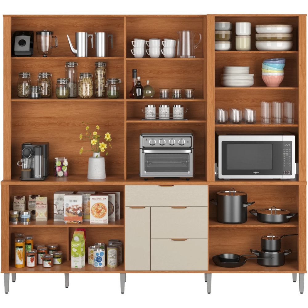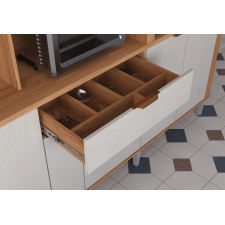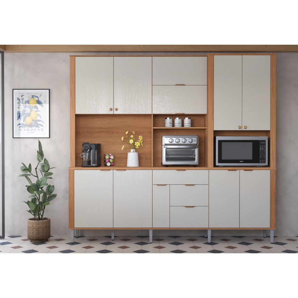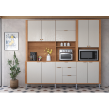 Ce grand meuble de cuisine est conçu pour offrir un maximum de rangement tout en apportant une touche moderne et chaleureuse à votre intérieur. Avec ses dimensions généreuses de 220 cm de hauteur, 255 cm de largeur et 41 cm de profondeur, il permet d’organiser facilement vaisselle, électroménager et provisions. Sa structure en MDP/MDF avec peinture sur bois assure solidité et durabilité, tandis que sa finition bois naturel associée à des façades beige apporte élégance et luminosité. Il comprend de nombreux compartiments ouverts et fermés, des portes pratiques et des tiroirs montés sur glissières télescopiques pour une ouverture fluide. Un tiroir est équipé d’un organiseur de couverts en MDP, et le plateau intermédiaire renforcé de 25 mm garantit une excellente résistance...