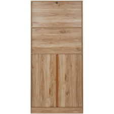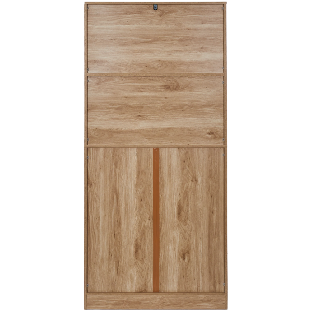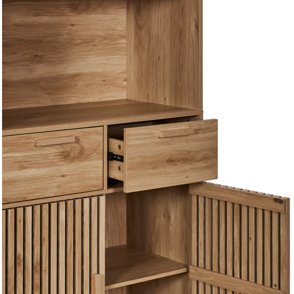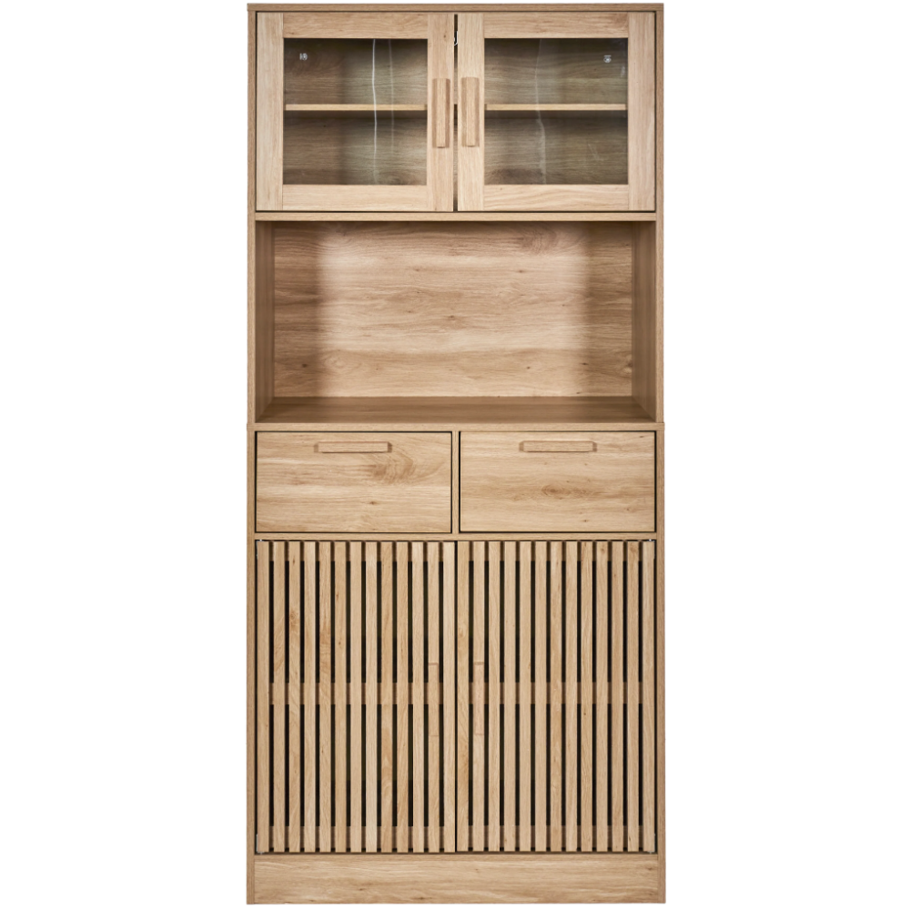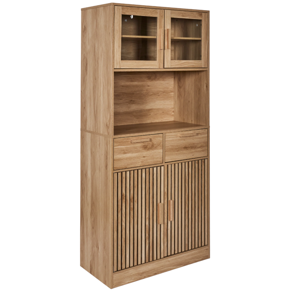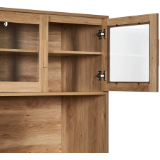 Buffet de cuisine Klaus présentant un design attractif avec une belle couleur boisée et un décor mixte incluant une texture lisse, des portières vitrées et des battants en cloisons - Propose jusqu’à 5 espaces pour le rangement des équipements et parures de cuisine répartis en 2 grands coffres, 2 grands tiroirs et une cavité ouverte pour disposer les objets de cuisine à usage régulier - Affiche une forme rectangulaire à la verticale convenable pour occuper peu d’espace dans la cuisine - Mesure 80 cm de long, 40 cm de large et 172 cm de haut - Repose sur une base compacte qui garantit sa stabilité et facilite son installation.