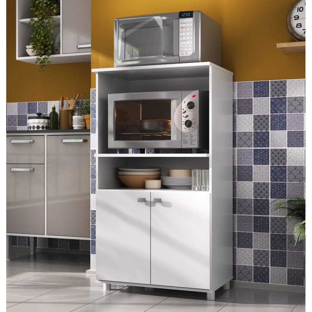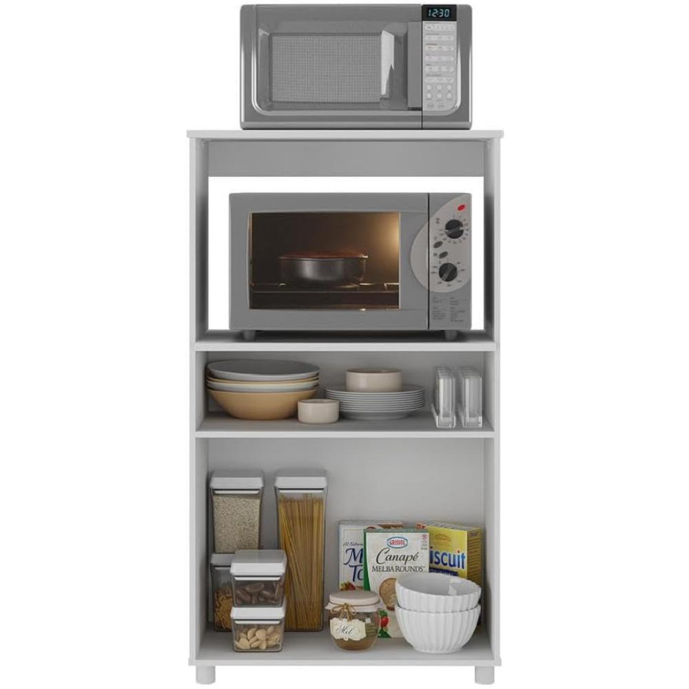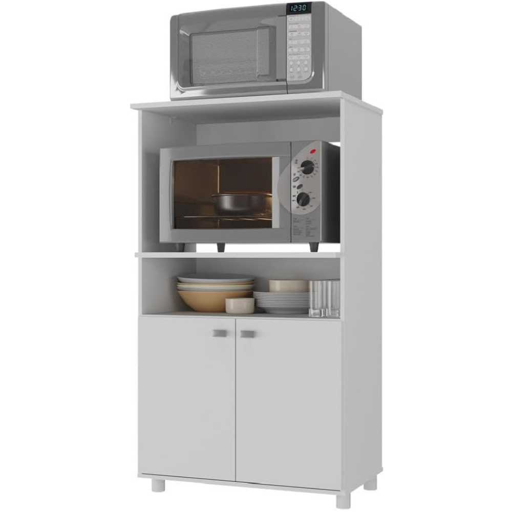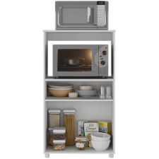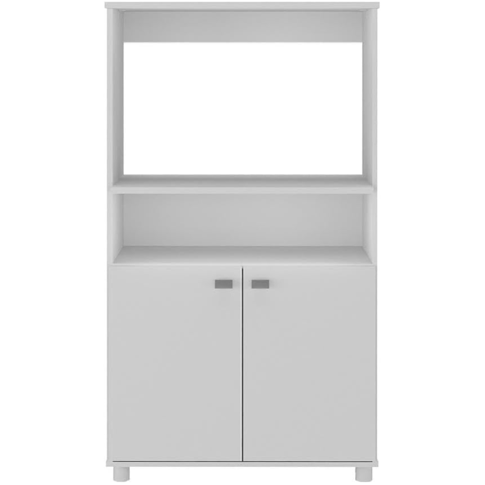Meuble pour micro-ondes fait avec une structure en panneaux de particules recouvert de papier blanc - Conçu dans un format compact et facile à installer - Constitué d’une étagère basse pour le rangement des tasses et d’autres accessoires de vaisselle - Embarquent une niche ouverte adaptée pour un emplacement de micro-ondes - Comprend un plateau supérieur pour un petit appareil électro-ménager - Inclut un meuble bas doté de 2 portes pour disposer divers éléments de cuisine - Repose sur 4 supports bas garantissant une stabilité permanente au meuble - Mesure 62 cm de large, 42 cm de profondeur et 113 cm de haut.