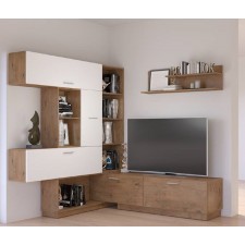 Living VARIO bois blanc brillant / chêne lancelot - Dimensions hors tout de l’unité murale : 3000 x 1885 x 401 mm (L x H x P) - Nombre de colis : 5 - Devant : panneau laminé 15mm Blanc brillant – Jante en mélamine – Poignée : plastique 128 mm - Corps : panneau stratifié 15mm chêne lancelot - Jante en mélamine - Mur arrière : Planche HDF chêne lancelot - 2 positionnement possible du meuble haut – Visible sur les photos : sur un mur – Au coin.
