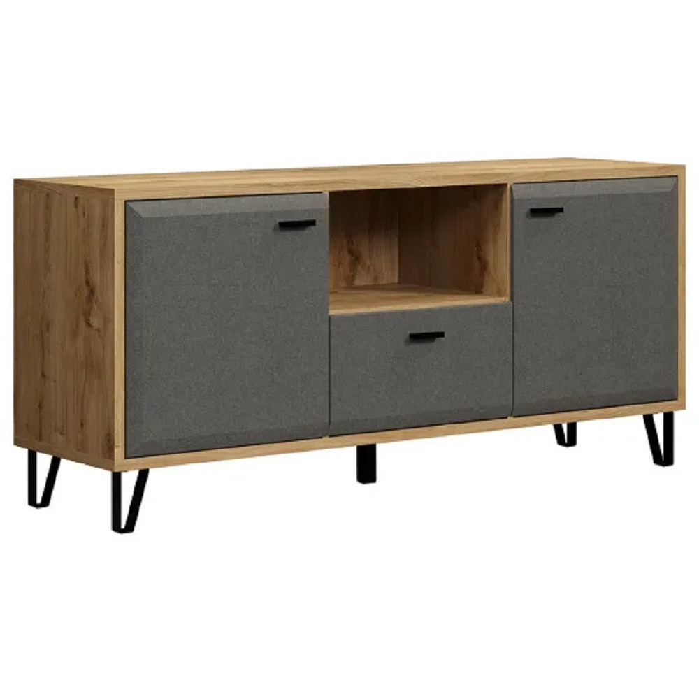 Table tv Athena fabriquée avec des matériaux de haute qualité - Comprend 1 porte, 2 tiroirs et 2 espaces centraux ouverts pour le rangement de périphériques numériques ou de petits objets numériques - Dimensions de la table tv : 157.6 cm de long, 51.2 cm de haut et 45 cm de profondeur - Conçue avec un cadre et un piétement de couleur noire contrastant parfaitement avec le coloris boisé clair de la porte et des tiroirs.
