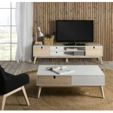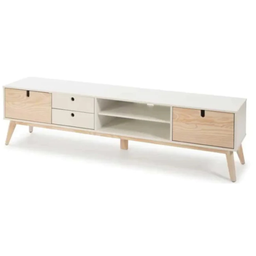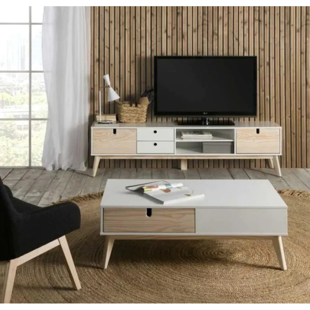 Inspiré du mobilier scandinave, ce meuble tv 2 portes 2 tiroirs apportera de la douceur dans la déco de votre salon - Reposant sur un piétement en pin assorti à deux des portes, ce meuble audio/vidéo à la dimension confortable bénéficie d'une qualité perçue satisfaisante, il est prévu pour supporter un grand écran - Bénéficiant d'un look indémodable ce meuble saura vous accompagner durablement - Dimensions : Longueur : 180 cm  - Largeur : 37 cm - Hauteur : 49 cm.