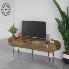 Meuble TV Saluso au style rustique et intemporel - Conçu en bois de noyer avec 2 espaces de rangement fermés et 2 espaces de rangement ouverts - Soutenu par des pieds en métal de couleur noire.