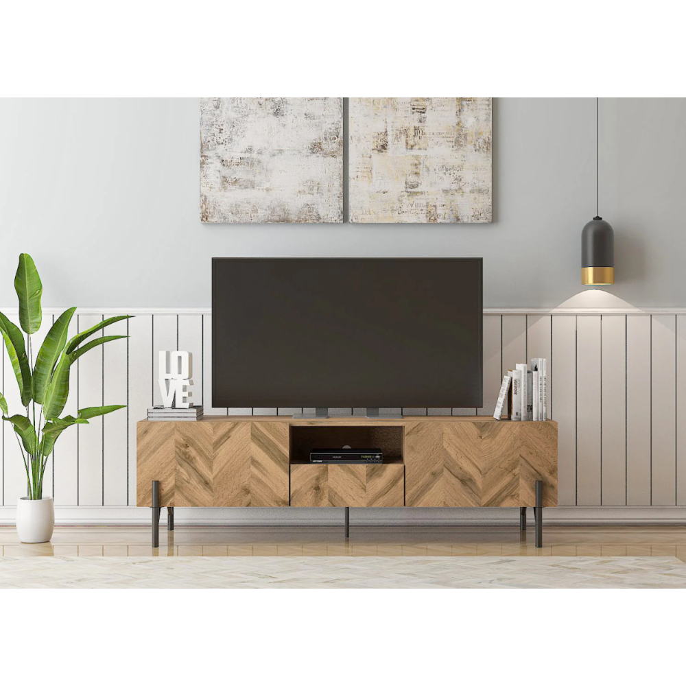Meuble tv à installer dans une salle de séjour - Conçu avec une structure en panneau de particules et MDF recouvert d’un papier coloris chêne - Embarque un long plateau supérieur et 4 cavités de rangement fermées - Dispose de portes lisses avec poignées intégrées offrant une manœuvre silencieuse - Mesure 35 cm de large, 180 cm de long, 38 cm de haut et fait 31.60 kg comme poids - Présente une conception sans pattes idéale pour un gain de place et un nettoyage facile sous le meuble.