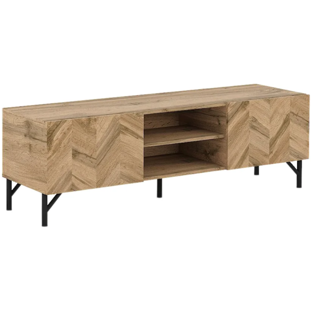 Table tv Athena fabriquée avec des matériaux de haute qualité - Comprend 1 porte, 2 tiroirs et 2 espaces centraux ouverts pour le rangement de périphériques numériques ou de petits objets numériques - Dimensions de la table tv : 157.6 cm de long, 51.2 cm de haut et 45 cm de profondeur - Conçue avec un cadre et un piétement de couleur noire contrastant parfaitement avec le coloris boisé clair de la porte et des tiroirs.