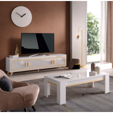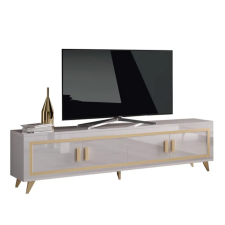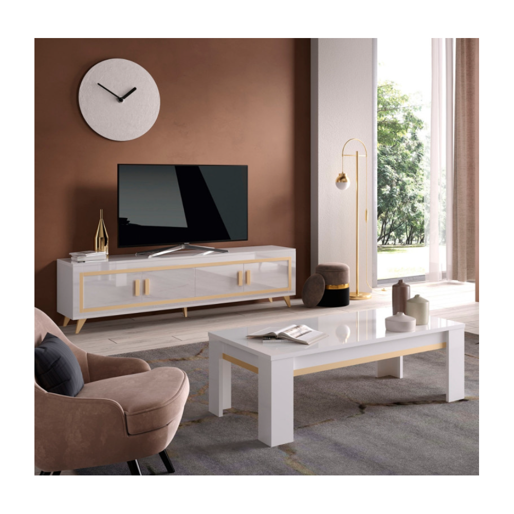 Meuble tv GOLD - 4 portes - Ses détails dorés apporteront du chic et de l'élégance. Ce meuble tv fonctionnel dispose de grands espaces de rangement fermés pour bien rester organisé. structure en panneaux écologiques e1 22 et 18mm. Pieds plastique h12cm. Poignées plastique. Finition : laqué brillant, vernis anti-uv. Charnières avec système de fermeture amortie. Dimensions : 207 x 45 x h54cm.