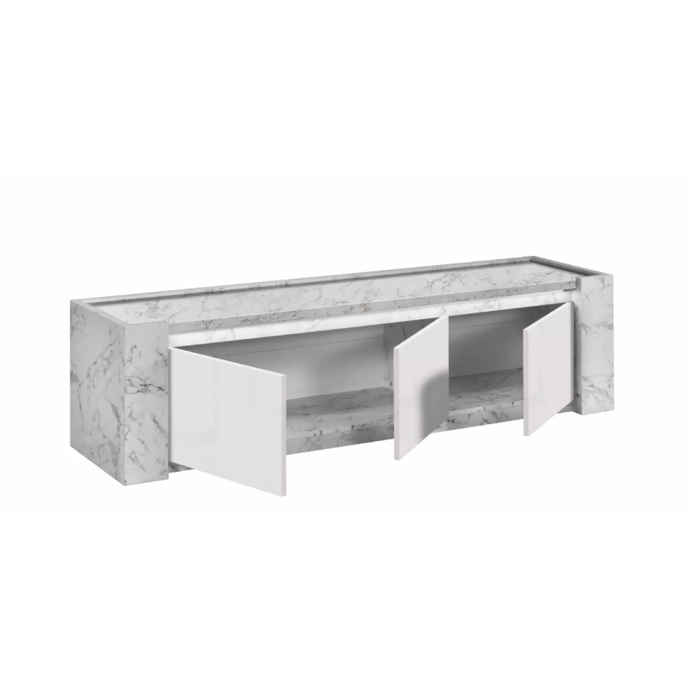 Meuble tv 3 portes 195cm laqué blanc et effet marbre - Une collection italienne de qualité pour moderniser et donner du cachet à votre intérieur - Un grand meuble tv original et tendance pour entreposer vos effets qui mettra en valeur votre salon - Structure en panneaux de particules écologiques e1 30 et 18mm - Finition : laqué brillant - Charnières avec système de fermeture amortie - Dimensions : 195 x 50 x h50cm.