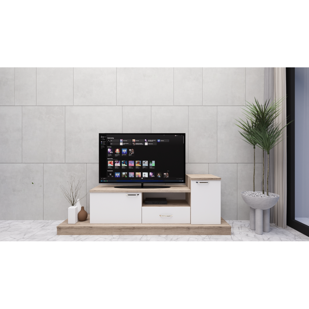Meuble TV Flora - Dimensions 2000x660x500 cm - Meuble tendance, un supplément fonctionnel et idéal pour créer un intérieur attrayant et moderne - Surface lisse - Grand espace de rangement: comprend 2 portes battantes, 1 tiroir et 1 niche, de quoi ranger des lecteurs DVD, consoles de jeux et appareils multimédias de façon bien organisée - Dessous robuste, idéal pour exposer des objets décoratifs (plantes en pot, vase, etc).
