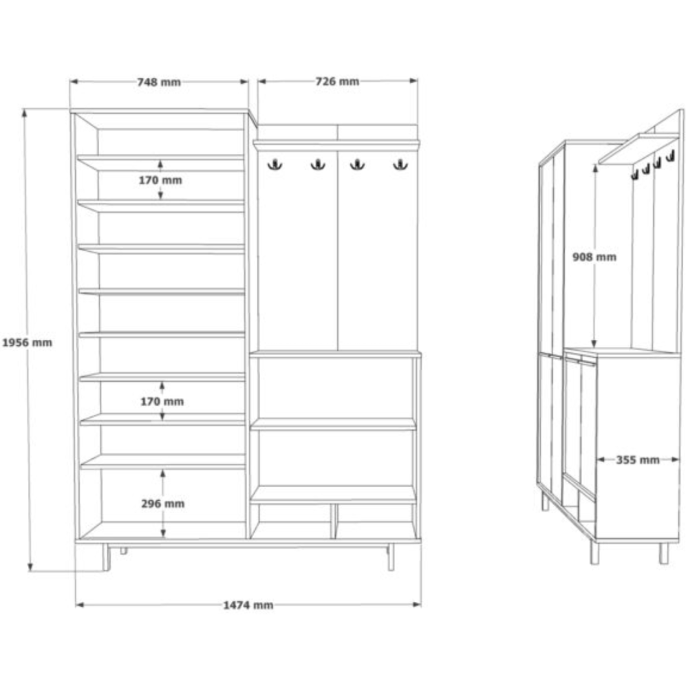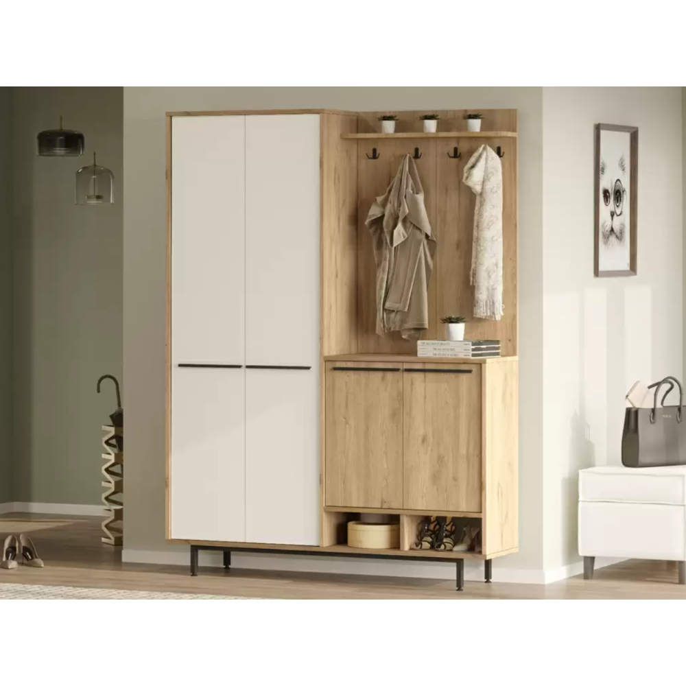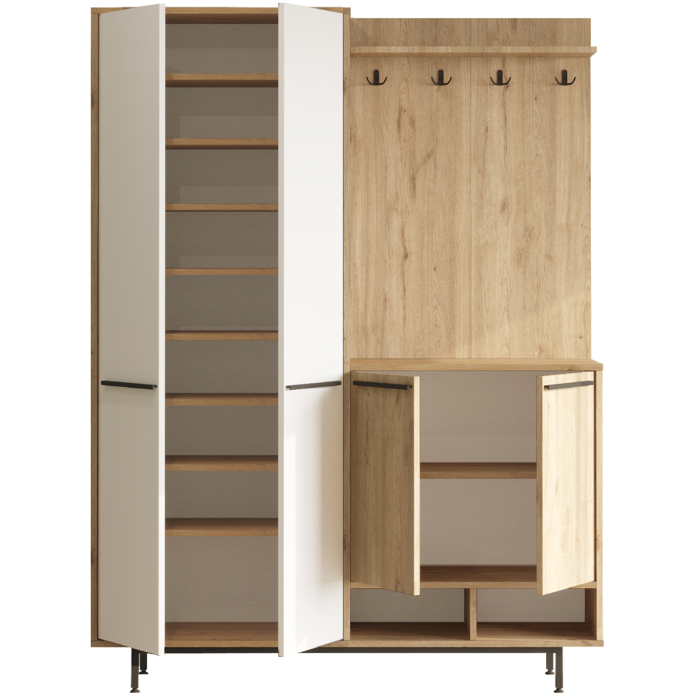 Meuble d'entrée OS1-SW avec placard à chaussures et patères coloris marron blanc finitions chêne - Fabriqué en panneaux de particules mélaminés chêne - Pieds en métal - Facile d'entretien et résiste bien aux rayures - Constitué de 4 portes, de 2 niches, de 10 étagères et de 4 accroches manteau - Dimensions : 147,4 × 35,5 × 195,6 cm.