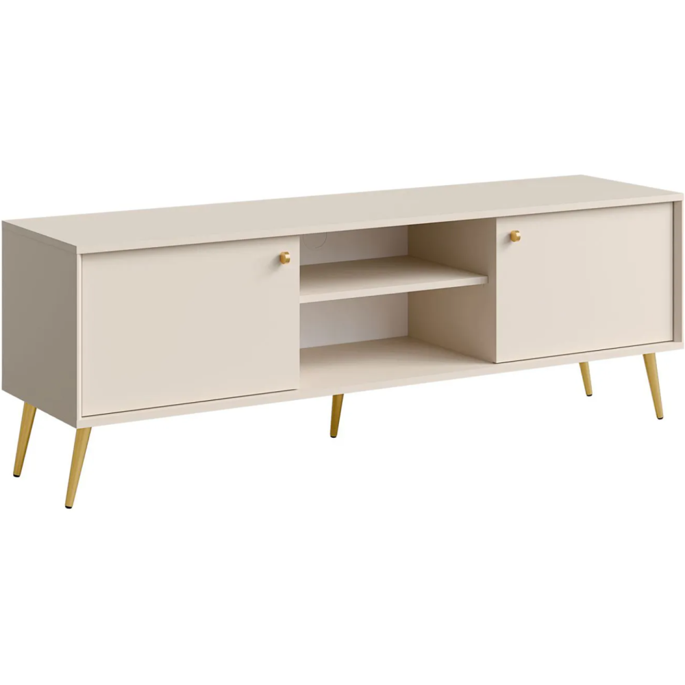 Meuble TV beige Rose Sand avec 2 portes battantes et 2 niches, soit 4 compartiments - Doté d'un design intemporel qui s'harmonisera très bien avec votre intérieur - La qualité des matériaux assure robustesse et longévité - Présente des finitions soignées et des détails en métal doré - Bords ABS, structure en bois composite et HDF pour une excellente stabilité - Poignées et pieds en métal doré - Convient parfaitement aux écrans plats de grande taille tout en optimisant l'espace.
