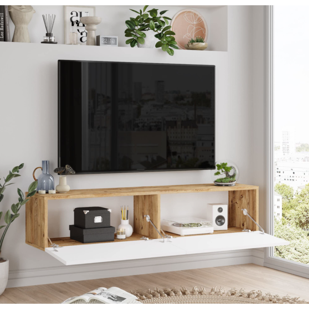 Table TV suspendue FR10-A effet chêne rustique au style raffiné au design épuré pour ajouter une touche de beau dans votre salon - Bénéficie de 2 compartiments fermés qui offrent un grand espace de rangement pour tous vos indispensables multimédias - Adaptation parfaite à tous les espaces - Se monte facilement et vous permet de profiter sans effort de votre TV - Structure robuste et facile d'entretien - Idéal pour optimiser la place et mieux organiser son intérieur.