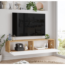 Meuble tv suspendu affichant un design bicolore chêne et crème - Convient pour n’importe quelle pièce de vie - Fabriqué en panneau de bois mélaminé - Doté d’une configuration originale incluant 5 espaces de rangement fermés et 1 étagère ouverte - Equipé d’un trou de passage pour faciliter la connexion de l’écran de télévision avec d’autres périphériques (box, barre de son, lecteur externe) - Dimensions du meuble tv : 200 cm de long, 35 cm de profondeur et 31 cm de haut.