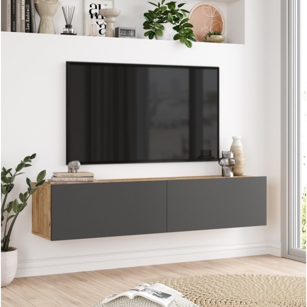 Table TV suspendue FR8-AA pratique et décoratif, ajoute à votre intérieur un style raffiné - Dotée de 2 portes rabattables et de deux étagères fermées - Peu encombrante et d'une grande capacité de charge, soit 28kg - Entretien facile - Coloris chêne gris - Se monte facilement - Permet de garder votre intérieur bien organisé en offrant un espace de rangement supplémentaire pour vos appareils multimédias, livres et autres articles - Ref FR8-AA-TV - Dimension 1800 x 316 x 290 mm.