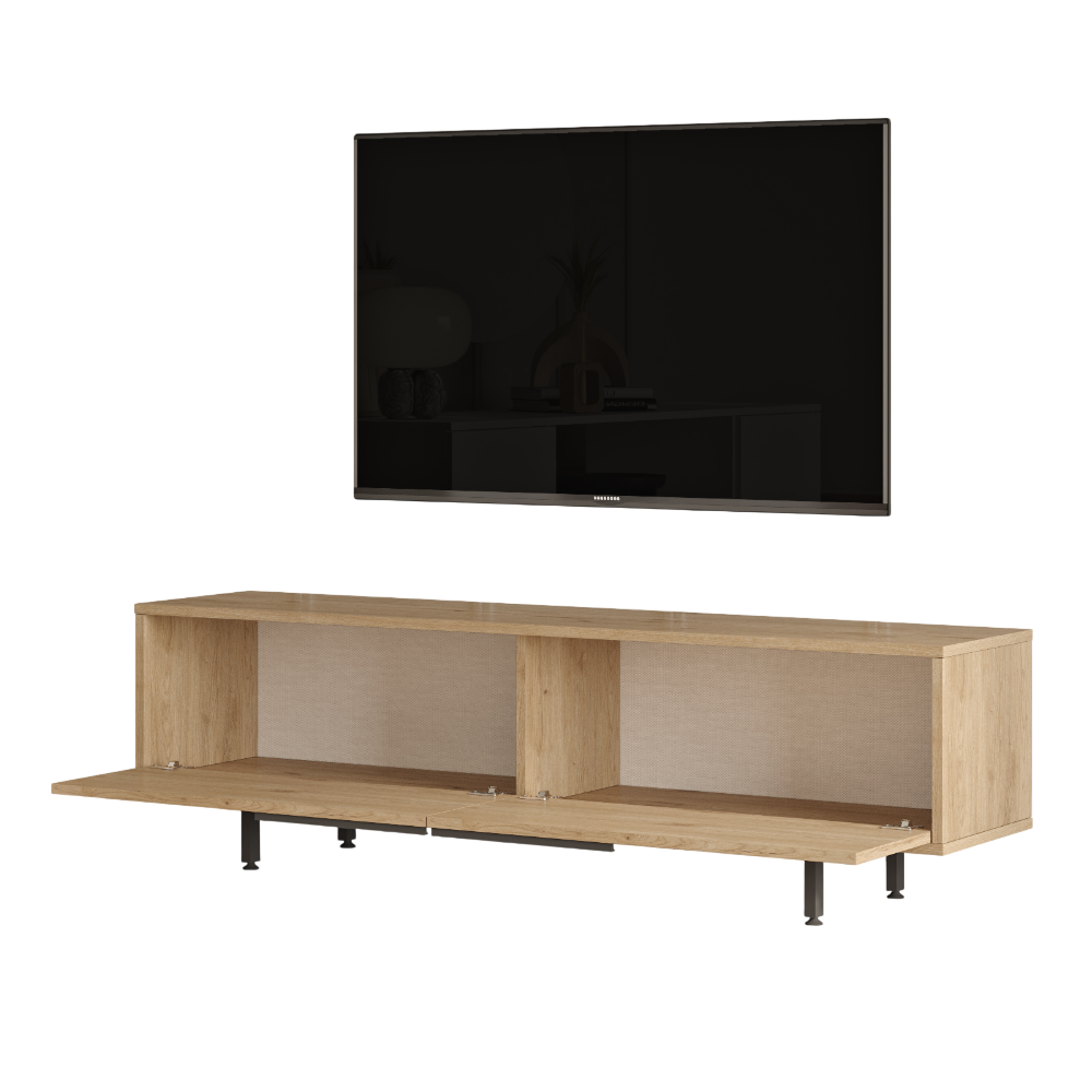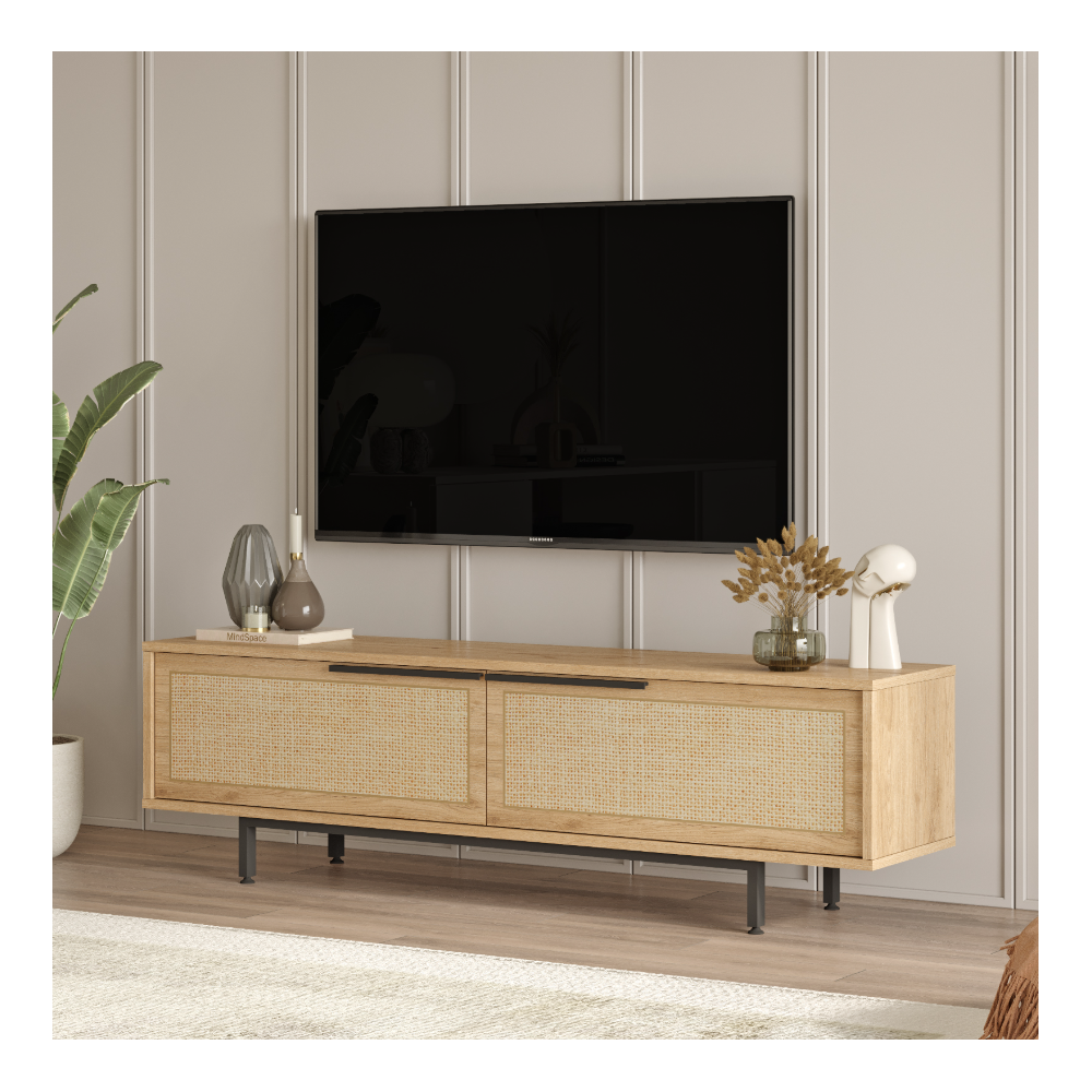 Le meuble TV ON1-SU avec 2 portes en bois et rotin clair est un meuble fonctionnel et attrayant qui ajoute une touche de nature et de confort à votre salon. Il est idéal pour créer un espace de divertissement pratique et élégant pour votre famille et vos invités. Le rotin apporte une touche de légèreté et d'ouverture, tandis que le bois apporte chaleur et solidité. Le meuble TV ON1-SU propose une surface généreuse pour votre téléviseur, vos consoles de jeux, vos lecteurs multimédias et autres équipements. Il est conçu pour que vos câbles soient bien rangés, évitant ainsi l'encombrement. Les 2 portes du meuble TV sont ornées d'un cannage qui ajoute une dimension de style et d'originalité. Ses portes dissimulent un espace de rangement pratique pour vos DVD, jeux, télécommandes ou autres objets que vous souhaitez garder à l'abri des regards. Choisissez notre meuble TV 2 portes ON1-SU pour créer un espace de divertissement pratique et élégant pour votre famille et vos invités. Dimensions: Longueur : 160 cm x Hauteur : 45.1 cm x Profondeur : 35.5 cm.