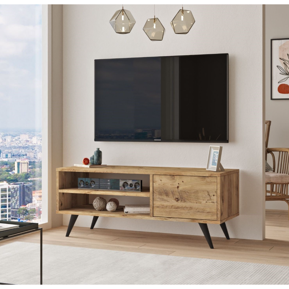 Meuble tv Klaus conçu avec un passage arrière pour les câbles de connexion des périphériques comme le décodeur, le lecteur audio ou un système de sonorisation - Formé d’une structure en bois et panneau composite de fibres de bois à densité - Fait 48 cm de haut, 117 cm de long et 40 cm de profondeur comme dimensions - Repose sur un piétement de 4 pattes moyennes fabriquées en bois et garantissant un équilibre permanent du meuble - Idéal pour accueillir un écran de petite, moyenne ou grande taille.