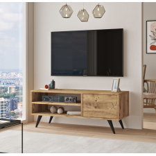 Table tv Athena fabriquée avec des matériaux de haute qualité - Comprend 1 porte, 2 tiroirs et 2 espaces centraux ouverts pour le rangement de périphériques numériques ou de petits objets numériques - Dimensions de la table tv : 157.6 cm de long, 51.2 cm de haut et 45 cm de profondeur - Conçue avec un cadre et un piétement de couleur noire contrastant parfaitement avec le coloris boisé clair de la porte et des tiroirs.