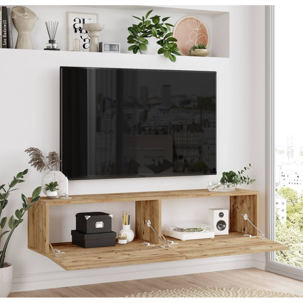 Table TV suspendue FR10-A effet chêne rustique au style raffiné au design épuré pour ajouter une touche de beau dans votre salon - Bénéficie de 2 compartiments fermés qui offrent un grand espace de rangement pour tous vos indispensables multimédias - Adaptation parfaite à tous les espaces - Se monte facilement et vous permet de profiter sans effort de votre TV - Structure robuste et facile d'entretien - Idéal pour optimiser la place et mieux organiser son intérieur.