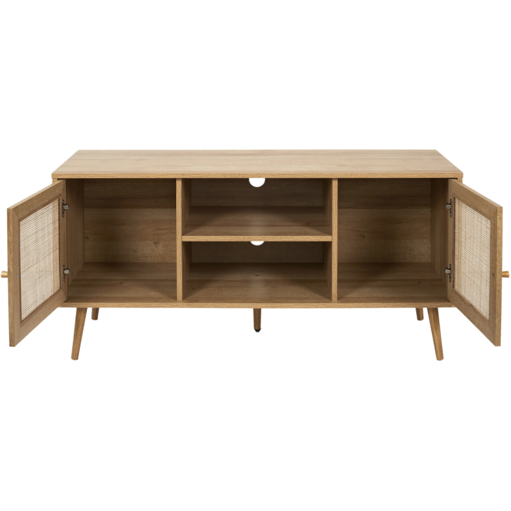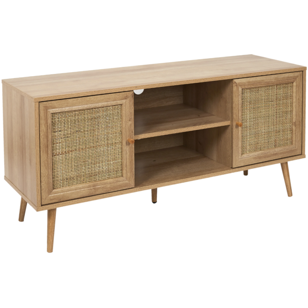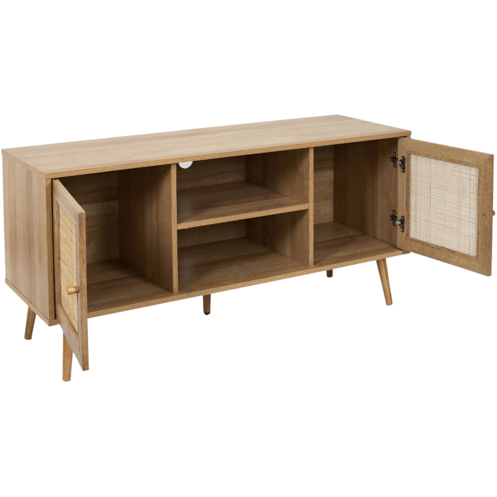 Meuble tv de haute qualité arborant un revêtement en papier décor boisé et une structure en panneaux de particules - Présente une façade en rotin et un piétement de 5 pieds fabriqués en bois d’eucalyptus - Embarque 4 cases de rangement internes pour l’insertion dont 2 fermées par des battants ergonomiques - Mesure 115 cm de long, 39 cm de large et 56,5 cm de haut - Convient pour les téléviseurs de toutes tailles à disposer sur le plateau supérieur de 115 cm de long.