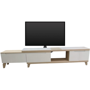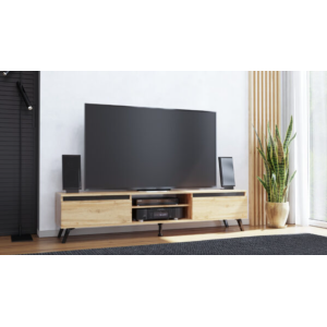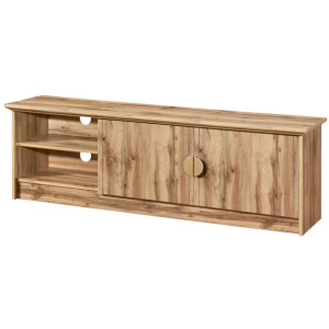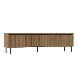 Meuble tv à installer dans une salle de séjour - Conçu avec une structure en panneau de particules et MDF recouvert d’un papier coloris chêne - Embarque un long plateau supérieur et 4 cavités de rangement fermées - Dispose de portes lisses avec poignées intégrées offrant une manœuvre silencieuse - Mesure 35 cm de large, 180 cm de long, 38 cm de haut et fait 31.60 kg comme poids - Présente une conception sans pattes idéale pour un gain de place et un nettoyage facile sous le meuble.