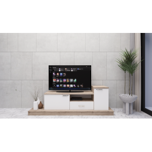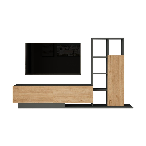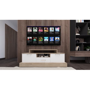 Meuble tv Inti recommandé pour les petits, moyens et grands écrans - Convient pour être installé dans une salle de séjour - Propose une installation en pose libre qui ne nécessite pas de matériel d’installation - Monté sur 4 pattes fermes qui garantissent sa stabilité et facilitent le nettoyage en dessous du meuble - Intègre un plateau supérieur pour accueillir l’écran et des coffres et étagères pour le rangement de périphériques comme les box, barres de son ou lecteurs externes.
