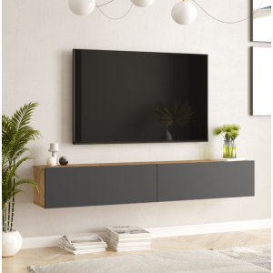 Table TV suspendue FR8-AA pratique et décoratif, ajoute à votre intérieur un style raffiné - Dotée de 2 portes rabattables et de deux étagères fermées - Peu encombrante et d'une grande capacité de charge, soit 28kg - Entretien facile - Coloris chêne gris - Se monte facilement - Permet de garder votre intérieur bien organisé en offrant un espace de rangement supplémentaire pour vos appareils multimédias, livres et autres articles - Ref FR8-AA-TV - Dimension 1800 x 316 x 290 mm.