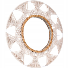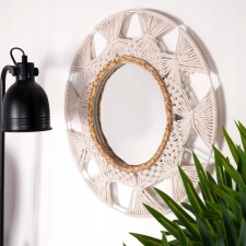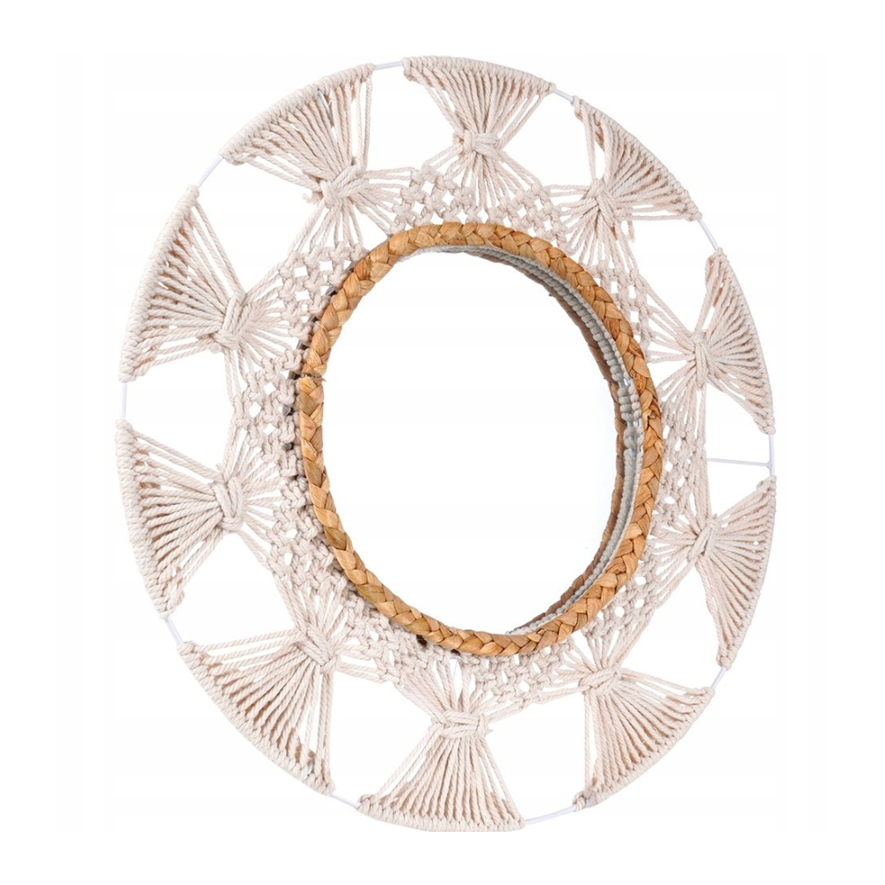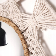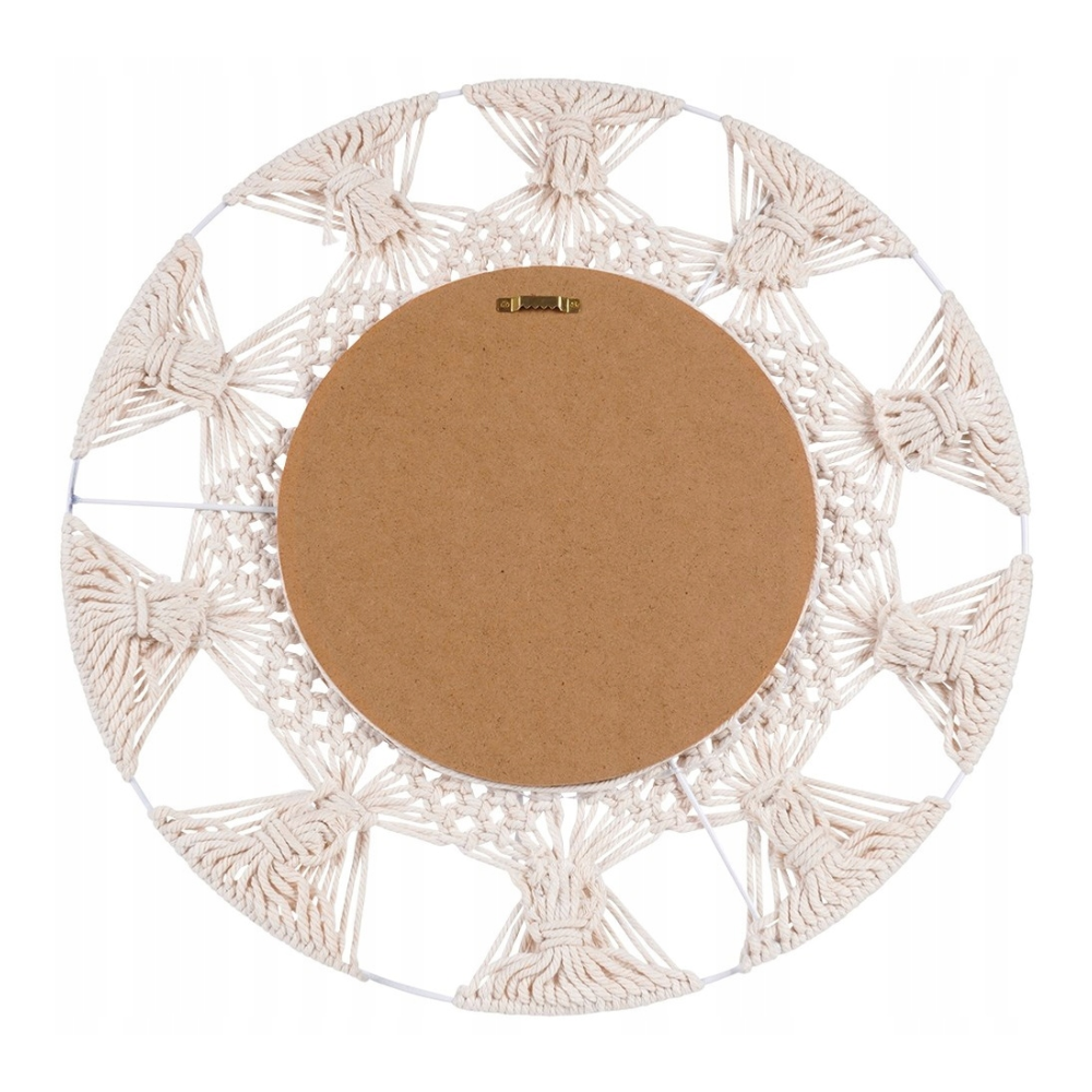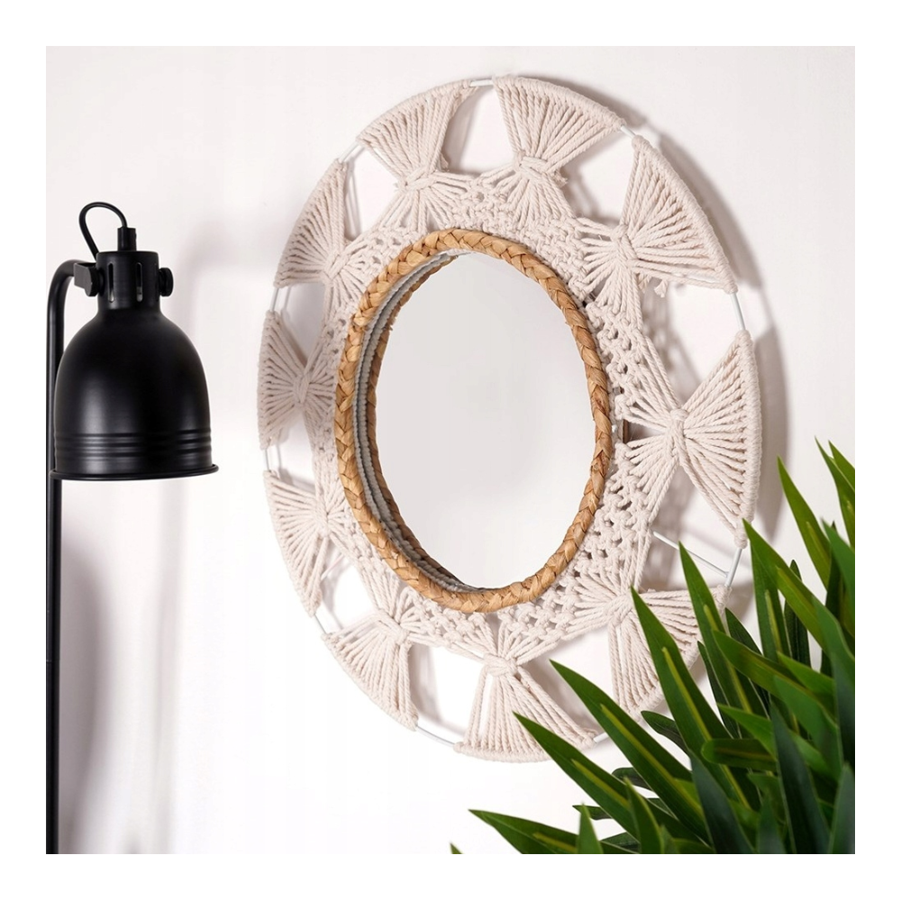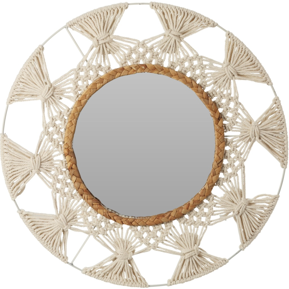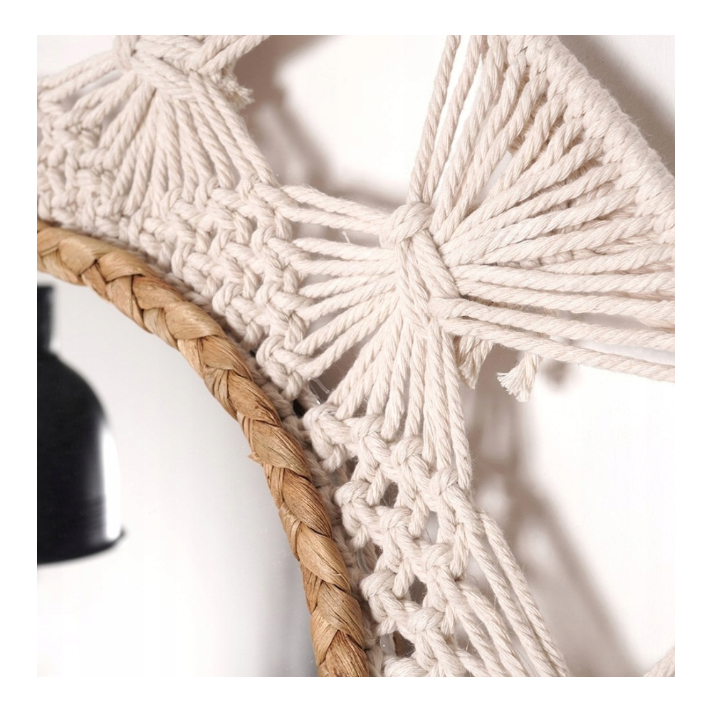Miroir décoratif avec cadre en osier - accent naturel d'un diamètre de 45 cm - Design Uniek avec des matériaux naturels : Le miroir décoratif d'un diamètre de 45 cm se distingue par son cadre original en macramé et rotin, qui ajoute du charme naturel et de la chaleur à tout intérieur - Ambiance de plaisir et de quiétude : Grâce au cadre en cannage en métal blanc et jonc de mer tressé, ce miroir apporte un subtil accent naturel à la pièce, créant une atmosphère harmonieuse de détente - Finition élégante pour n'importe quelle pièce : Le miroir décoratif rond avec cadre en rotin est une décoration extraordinaire pour le salon, la chambre ou le couloir, apportant un charme subtil et une élégance à la pièce - Agrandissement visuel de l'espace : Les grands miroirs décoratifs sont un excellent moyen d'agrandir optiquement l'espace et de lui donner luminosité et légèreté. Le miroir d'un diamètre de 45 cm s'intègre parfaitement dans différents aménagements intérieurs. Le diamètre du verre miroir lui-même est de 23 cm - Allier beauté et fonctionnalité : les miroirs décoratifs Ø 45 cm ne sont pas seulement une décoration, ils remplissent également un rôle pratique au quotidien, donnant à la pièce un caractère unique.