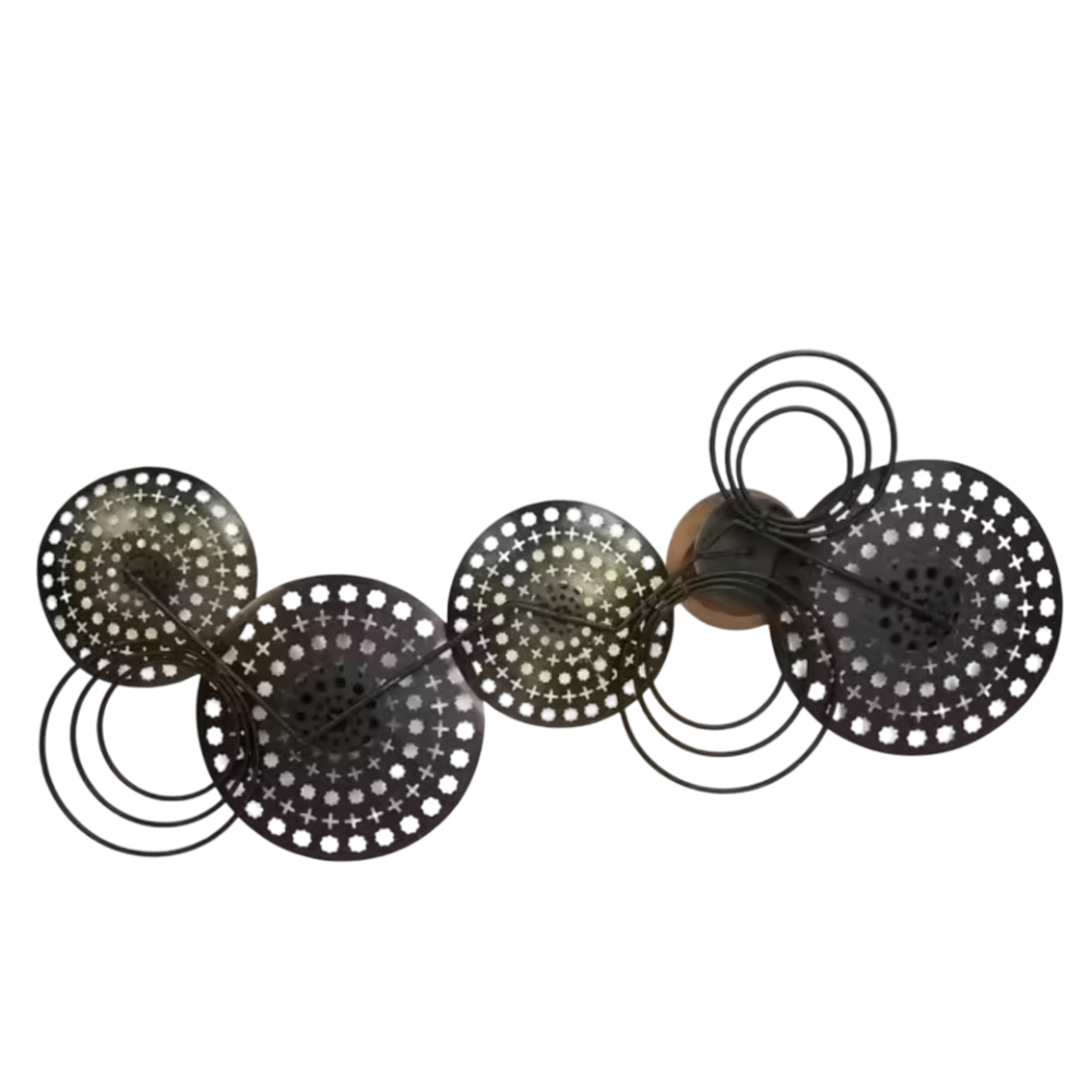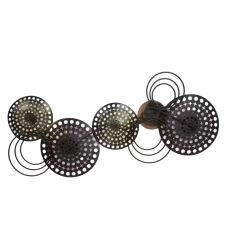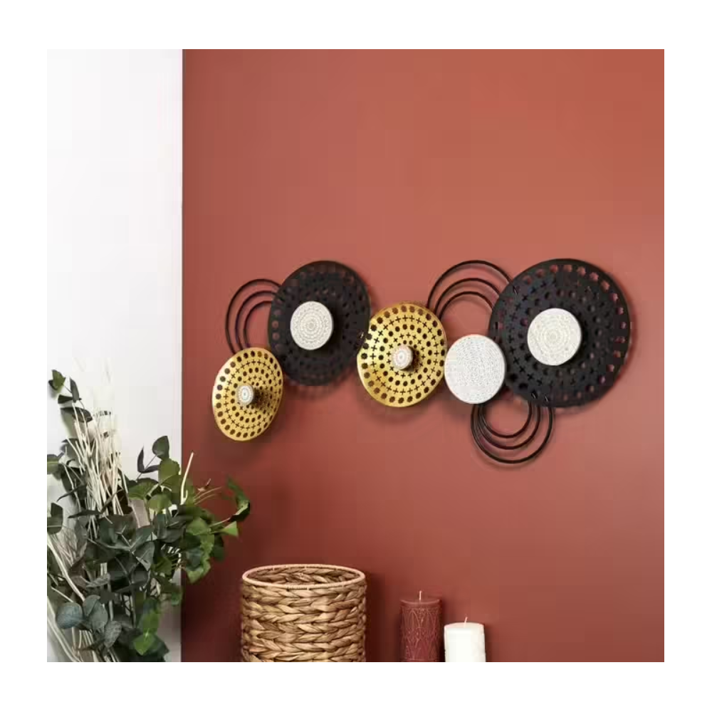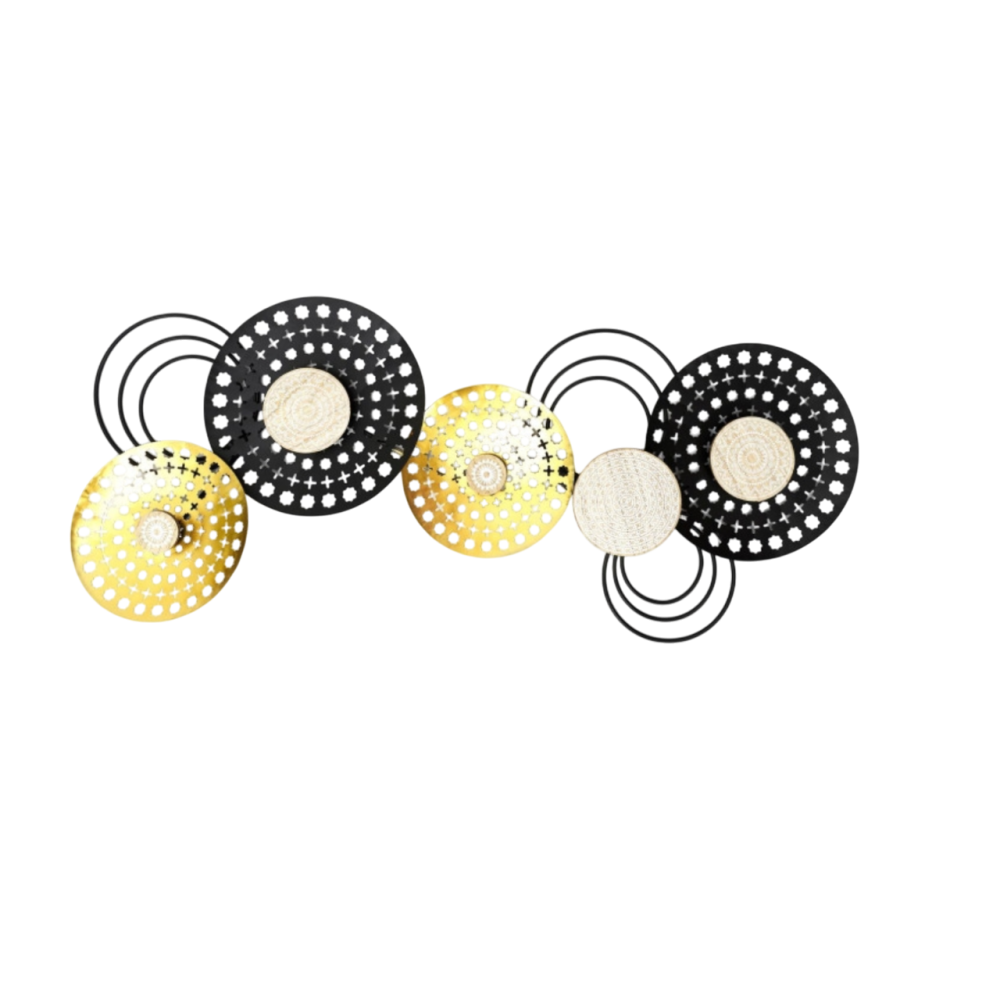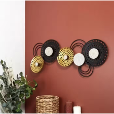 Décoration murale Mirage (Ø 63 cm) en métal noir et doré, conçue comme un cercle élégant aux finitions raffinées. Son design sophistiqué et sa nuance bicolore apportent une touche raffinée et contemporaine à tout intérieur. Avec des dimensions de L 47 × l 63,5 × H 7 cm et un poids d’environ 1 kg, elle reste légère à suspendre tout en marquant fortement le mur. Idéale pour enrichir un salon, une entrée ou une chambre avec style et personnalité.