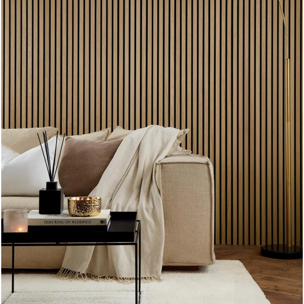 Panneau mural tasseau - 1188C-Plaque MDF et feutrine 600 x 2400 mm. Les Plaques MDF perforé laminé et mousse acoustique combinent esthétisme, isolation et simplicité d’installation, idéal pour embellir et optimiser vos espaces intérieurs. Coloris OAK.