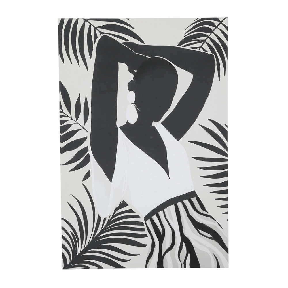 Apportez une touche d’élégance et de modernité à votre intérieur avec le tableau FEMME NOIR en toile 60x90 cm. Son design artistique en noir et blanc met en valeur une silhouette féminine stylisée au milieu de feuillages exotiques, créant un contraste saisissant et raffiné. Idéal pour un salon, une chambre ou un bureau, ce tableau au style contemporain et minimaliste apporte caractère et sophistication à votre décoration. Une œuvre graphique et intemporelle qui attire tous les regards.
