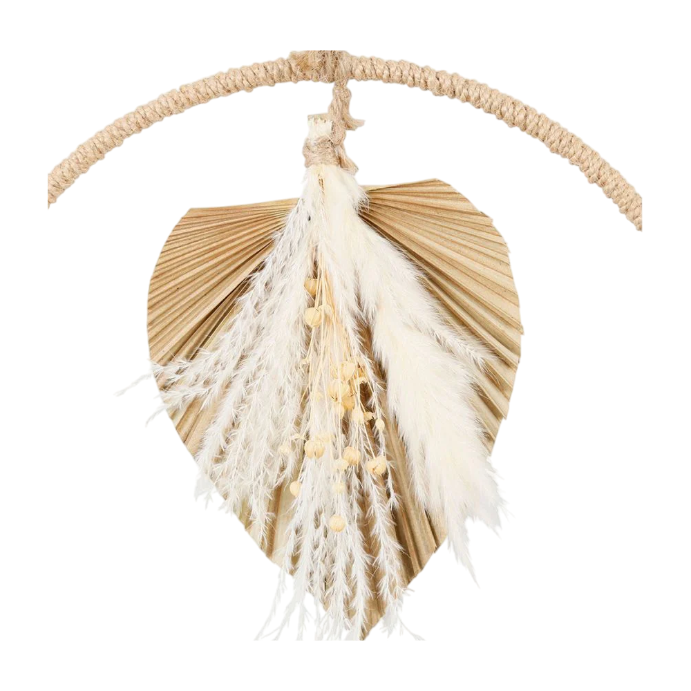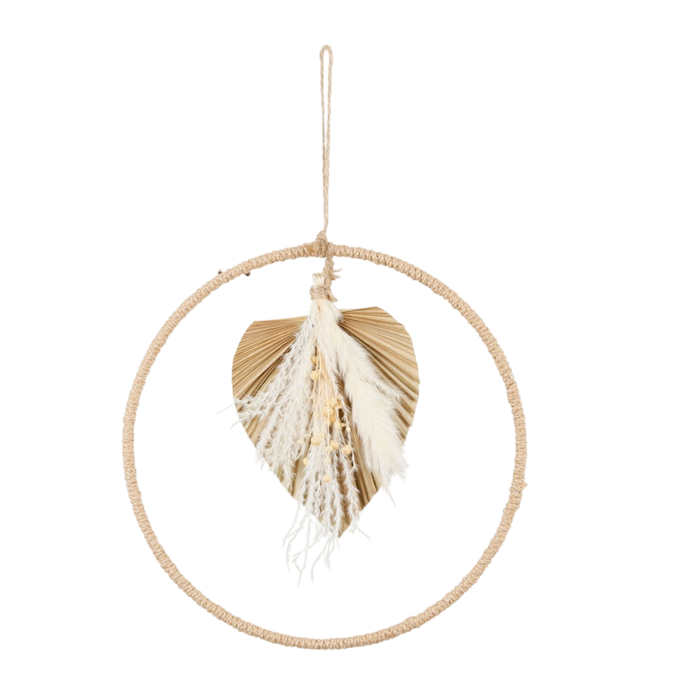 Apportez une note bohème et naturelle à vos murs avec cette délicate décoration à suspendre en forme de palmier. Entièrement conçue en fleurs séchées, elle sublime vos espaces avec légèreté et élégance. Matière : Fleurs séchées. Couleur : Naturel. Style : Bohème chic, naturel, organique. Diamètre: 30.5cm.