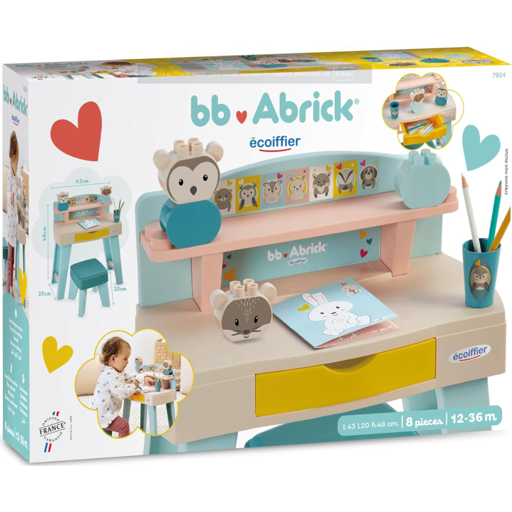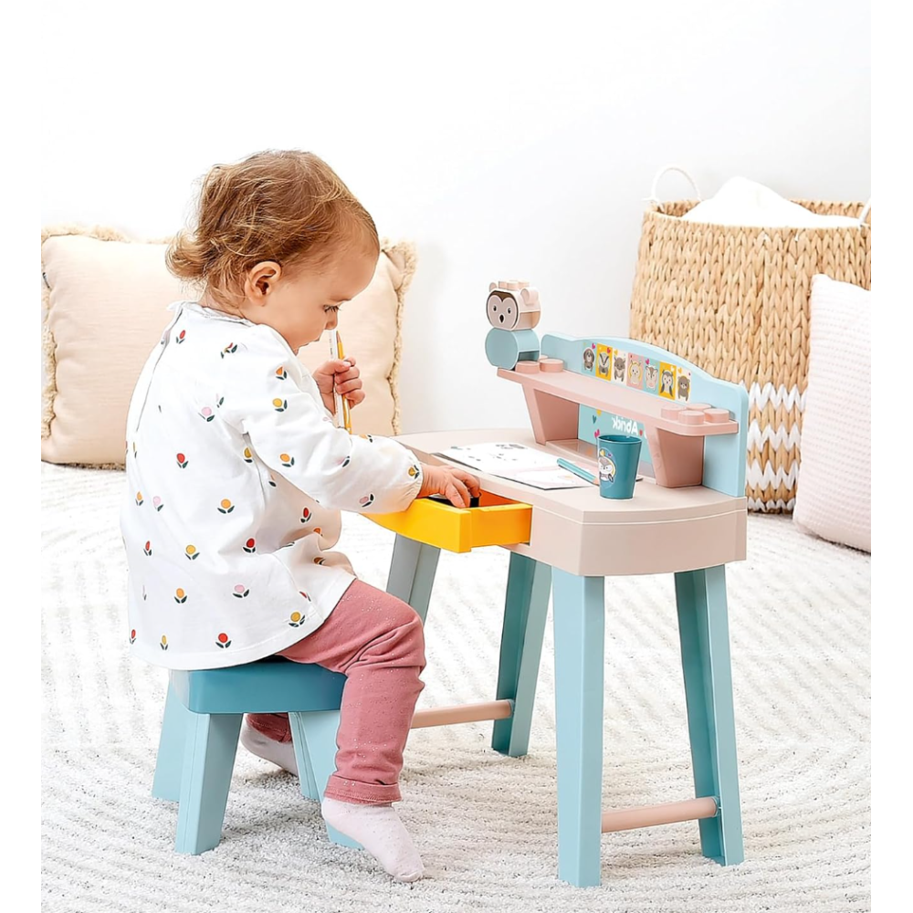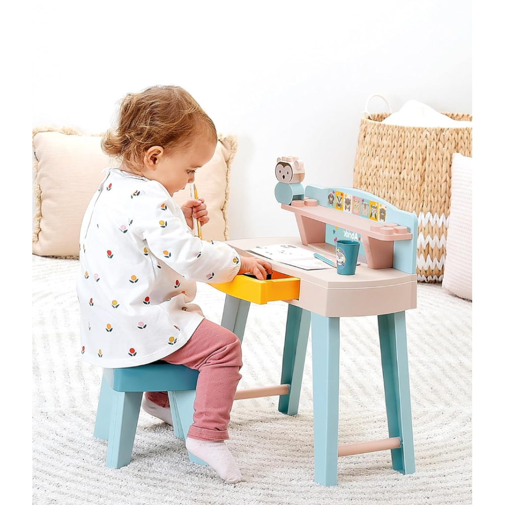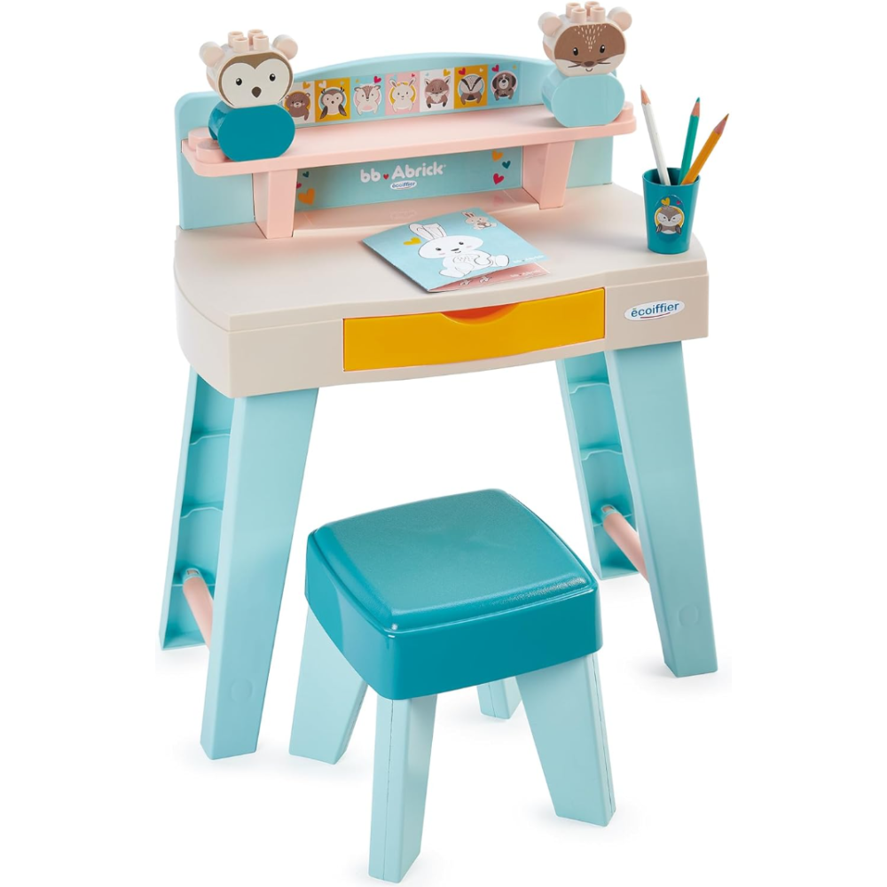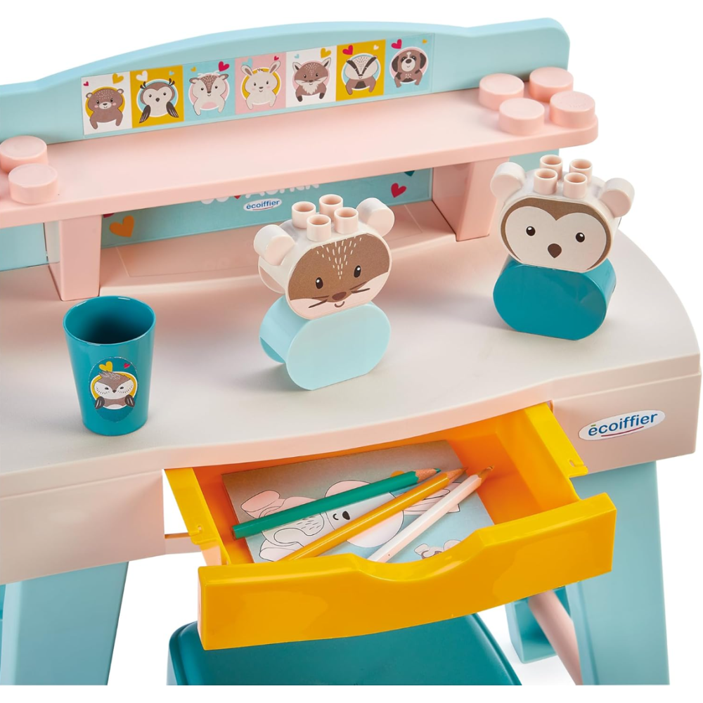 Mon premier bureau Ecoiffier conçu pour offrir à l’enfant un espace de travail confortable dès 12 mois - Accompagné de deux compagnons en jouet, créant ainsi un environnement ludique et stimulant pour les premières expériences de travail et de jeu - Offre une utilisation à la fois confortable et sécuritaire - Inclut une petite étagère de rangement et 1 tabouret conçu sur mesure - Monté sur des pattes hautes et épaisses qui assurent la stabilité de la table - Arbore des couleurs légères et douces qui conviennent à n’importe quel décor - Convient pour faire ses premiers coloriages comme un grand - Inclut 2 petites figurines et une boîte de crayons.
