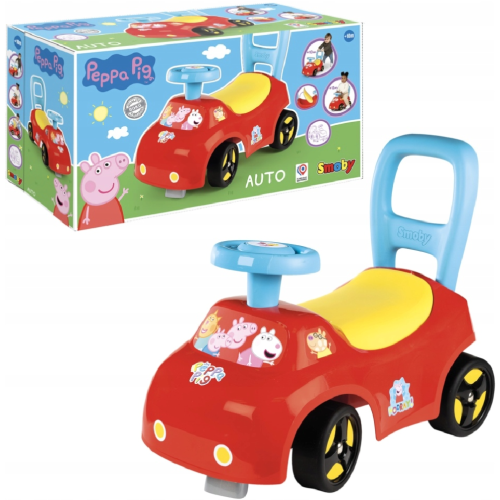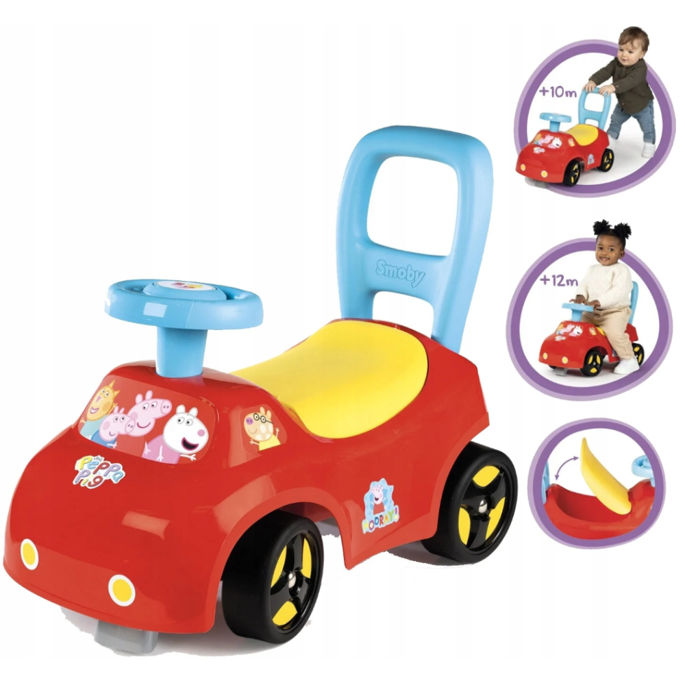 Porteur auto Peppa Pig conçu dans un design ultra moderne avec des motifs et des couleurs captivants - Peut être utilisé comme aide à la marche grâce à la poignée arrière, puis comme porteur - Intègre un volant réaliste qui transporte les tout-petits dans une aventure de transport stimulante - Fait exactement 54 cm de long, 27 cm de large et 40 cm de haut - Embarque un système anti-bascule avant et arrière qui le rend stable et garantit la sécurité de l’enfant en toute circonstance - Dispose d’une conception ergonomique et maniable grâce à son volant directionnel et son grand coffre de rangement sous la selle.