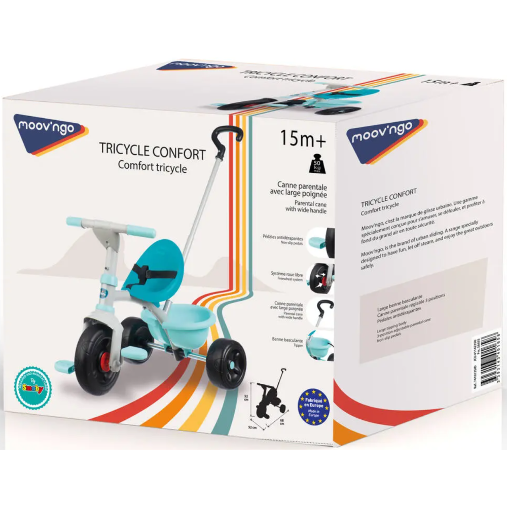 Tricycle confort Tmimi fabriqué avec un cadre en 100% métal - Mensurations du tricycle : 68 cm de long, 52 cm de large et 52 cm de haut - Dispose d’un siège enveloppant réglable sur 2 positions et équipé d'une ceinture de sécurité - Embarque une canne parentale avec une large poignée réglable sur 2 positions pour garder le contrôle du véhicule pendant les promenades - Doté de pédales antidérapantes et d’une benne basculante - Inclut un système roule libre avec blocage de direction - Convient pour transporter les enfants de 50 kg ou moins - Dispose d’un guidon haut et de 2 poignées confortables pour offrir un maximum de plaisir et de sécurité à l’enfant à partir de 15 mois - Fourni avec une notice de montage pour une installation rapide.