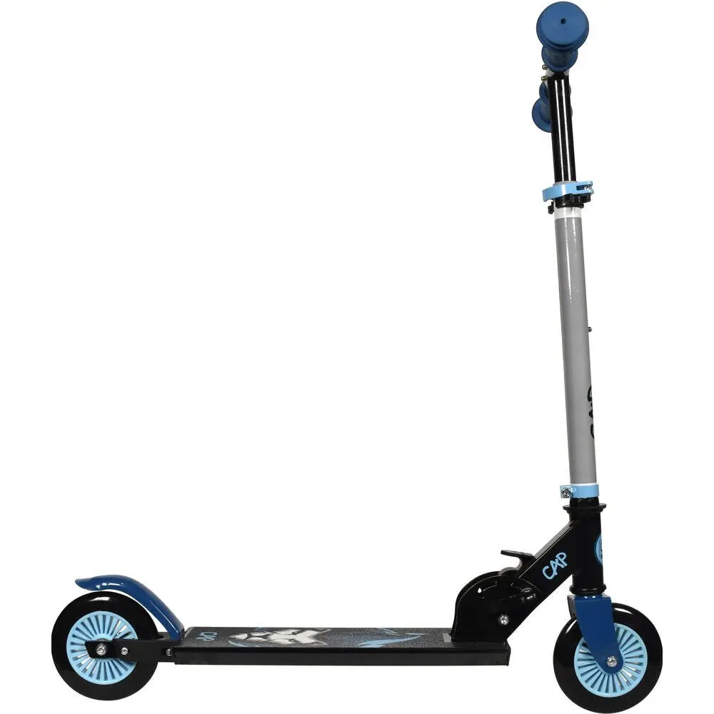 Trottinette pliable de couleur bleue fabriquée avec une structure en acier de haute qualité - Présente des poignées pliables et rétractables en plastique souple - Mensurations de la trottinette : 66 cm de long, 32 cm de large et 81 cm de haut - Peut supporter une charge maximale de 20 kg - Intègre un guidon T-bar réglable sur 3 niveaux (de 71 à 81 cm) - Embarque un frein sur la roue arrière - Monté sur 2 roues de 121 mm de diamètre conçues en PVC - Fabriquée avec un plateau recouvert d’un grip antidérapant - Convient pour les enfants de 4 ans et plus - Taille minimale /maximale requise : 0 ;95 mètre / 1.20 mètre.