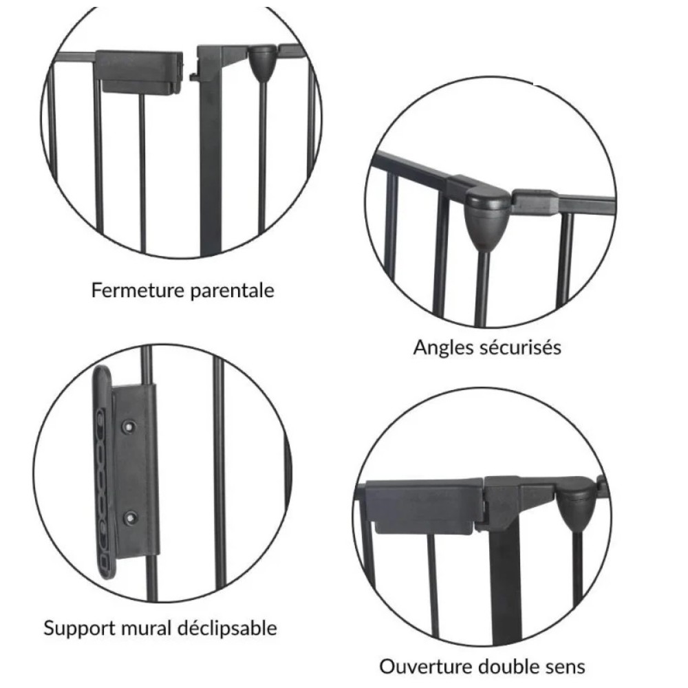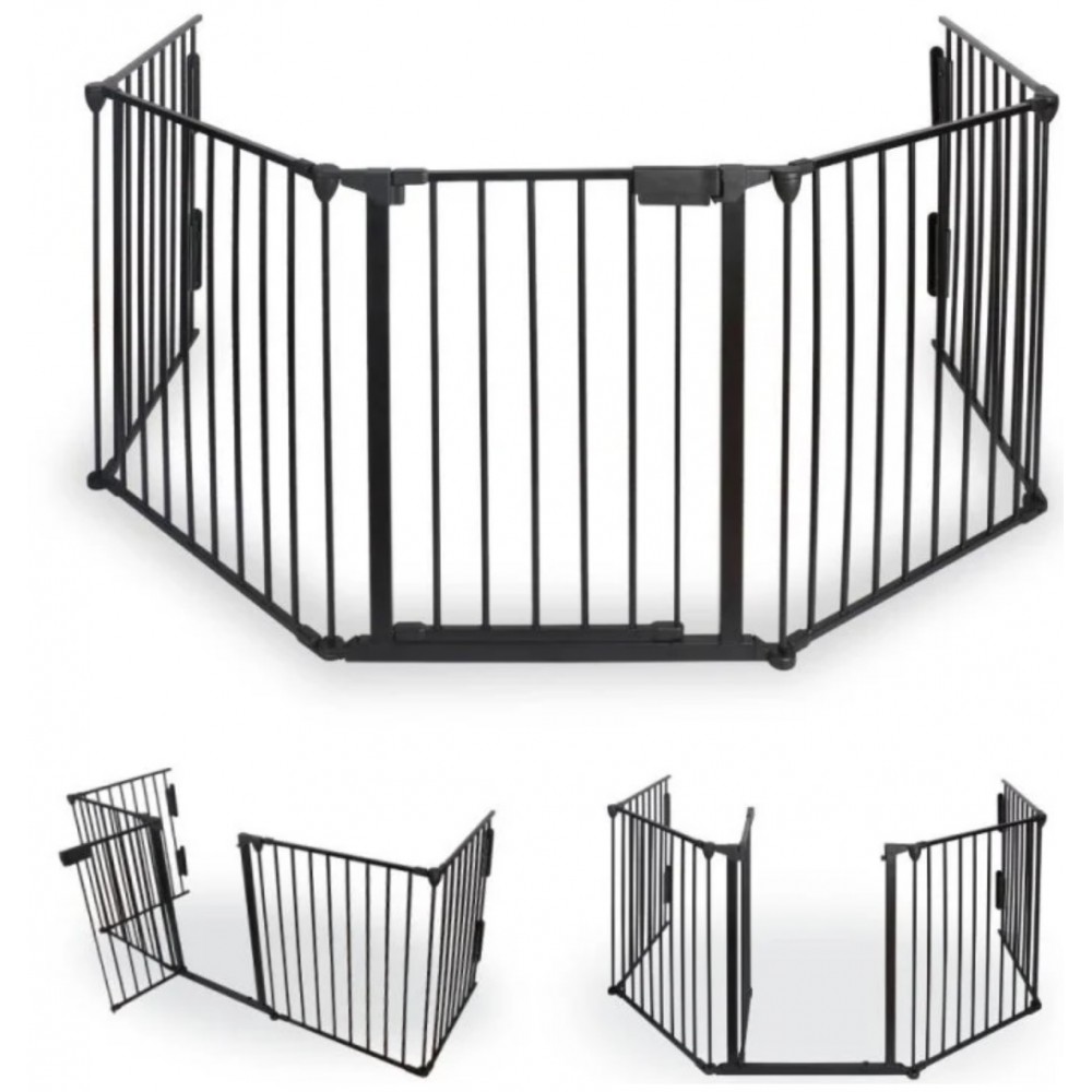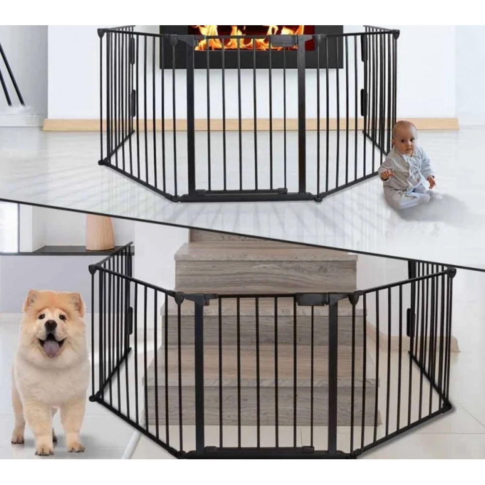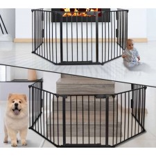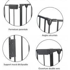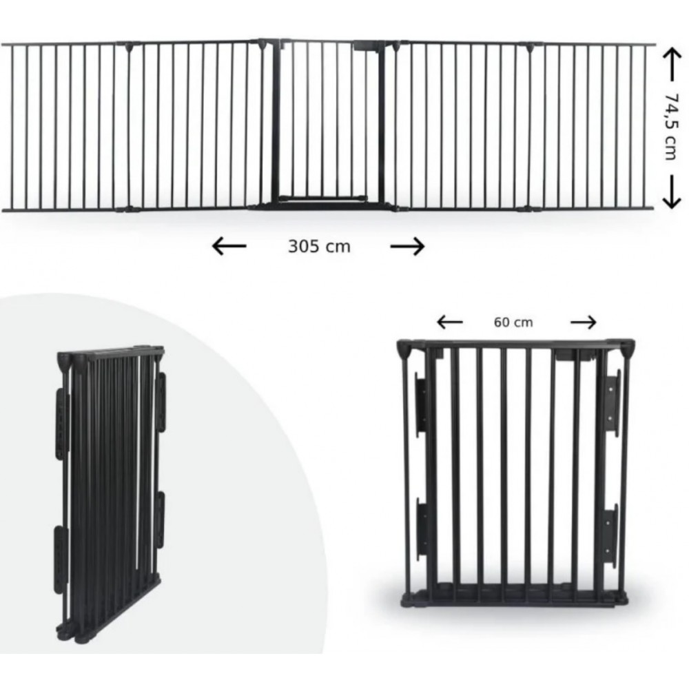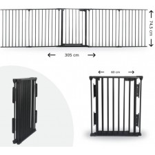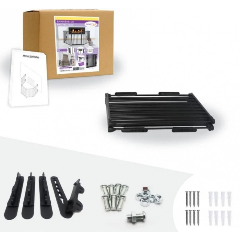 Barrière de sécurité enfant, bébé, animaux - 3 m, 5 panneaux. Cette barrière de sécurité permet de sécuriser les espaces à l'intérieur de votre maison. Très pratique devant un escalier, un four, une cheminée, une fenêtre, cette barrière de protection ferme l'accès à une zone de potentiel danger pour votre enfant, bébé ou animal de compagnie. Très simple et rapide à monter, cette barrière de sécurité est ajustable et modulable en fonction de votre besoin. Les pans peuvent se plier dans les deux sens et donner à la barrière la forme de votre souhait. Pliable, elle est aussi facile à transporter qu'à ranger. La barrière de sécurité enfant, bébé et animaux, une fois assemblée, se posera de partout. Elle tient seule mais peut être fixée au mur pour une meilleure stabilité et pour garantir la sécurité de vos enfants. Sa poignée de sécurité permet aux adultes d'ouvrir la porte dans les deux sens. Avec un design moderne, cette barrière se fondra dans la décoration de votre ameublement. Informations techniques. Matière : métal. Dimensions : hauteur : 74,5 cm, longueur maximum : 305 cm, longueur par panneau : 60 cm, diamètre barreau : 1 cm, espace entre chaque barreau : 6 cm. Poids : 15.86 kg. Couleur : noir peinture résistant à la chaleur. Utilisation : intérieur (non recommandée pour un usage extérieur car la barrière ne dispose pas du traitement adéquat). Vendue avec : pattes de fixation murale, supports muraux, accessoires de fixation (vis, écrous, chevilles). Outils non fournis nécessaire au montage : tournevis cruciforme. Ce type de barrière est idéal pour protéger des dangers d'une cheminée ou d'un poêle. Grâce à sa forme adaptable et sa longueur de 3 mètres, vous devriez parvenir à répondre à un grand nombre de situations avec ce produit.