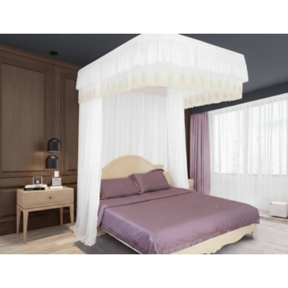 Moustiquaire ciel de lit avec envergure de 12 mètres environ.