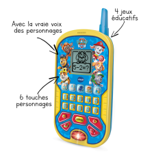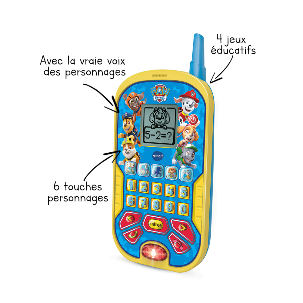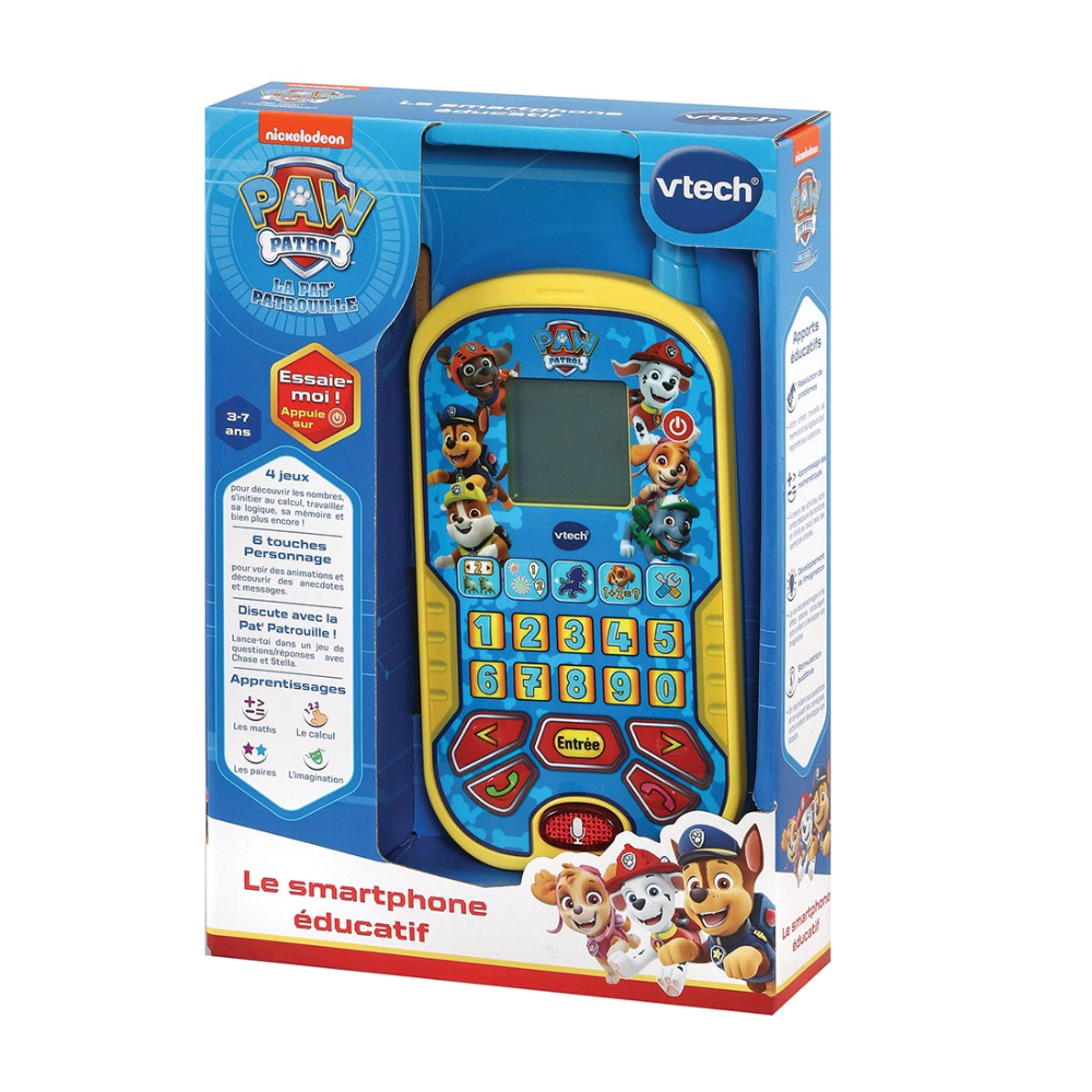 Un smartphone interactif pour apprendre en s’amusant avec les personnages de la Pat’ Patrouille 6 activités éducatives pour jouer avec la Pat’Patrouille et boutons appel pour appeler ses héros préférés et recevoir des messages vocaux ! Apprentissage des chiffres, de la logique, mémorisation, calcul et discussion avec les chiots. 1 bouton conversation pour jouer à un jeu de questions-réponses. 1 touche appel pour imiter une conversation avec les personnages de la Pat’ Patrouille. Écran LCD et boutons lumineux. Avec la vraie voix des personnages. Arrêt automatique et réglage du volume sonore. Âge requis : dès 3 ans. Piles : 2 piles LR6 fournies. Dimensions de l’article : L2 x l8 x h15 cm.