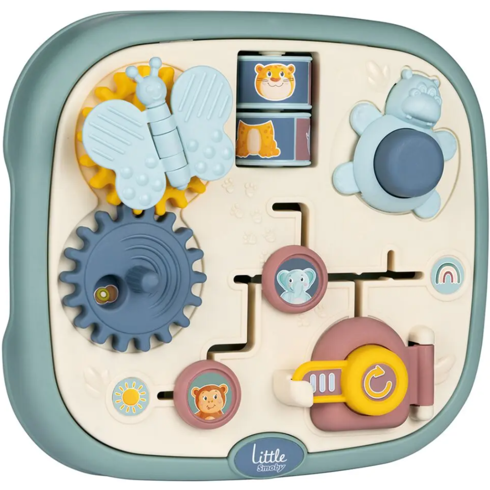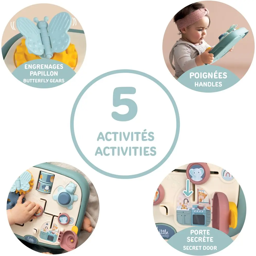 Tablette d’activités Little Smoby intégrée de 5 activités différentes et originales : un labyrinthe, une porte à verrou, des engrenages entraînant le battement des ailes du papillon, deux rouleaux pour créer des animaux rigolos et un hippopotame qui bouge les pattes lorsqu'on appuie sur son ventre - Fait précisément 23 cm de long, 25 cm de large et 6 cm de haut - Aide à développer la dextérité de bébé à travers les différentes actions requises : tourner, pousser, déplacer, appuyer, etc - Dotée de poignées sur le côté pour permettre à bébé d’avoir une bonne prise en main - Fabriqué avec un plastique durable assurant une grande durabilité - Présente des formes arrondies assurant un jeu sécurisé aux enfants de 12 mois et plus.