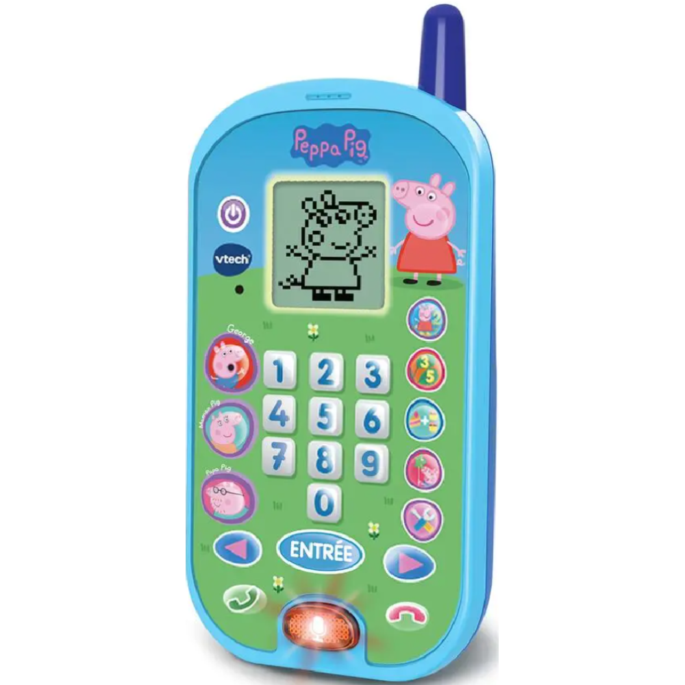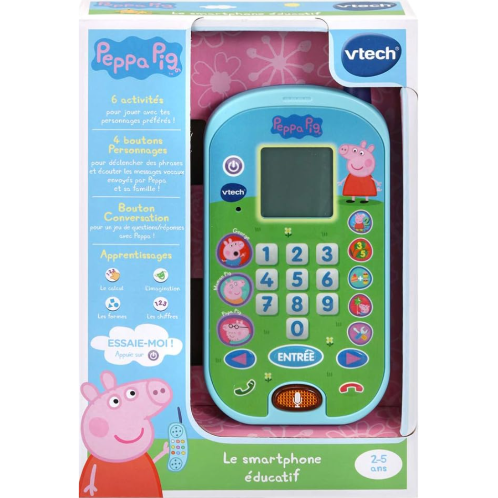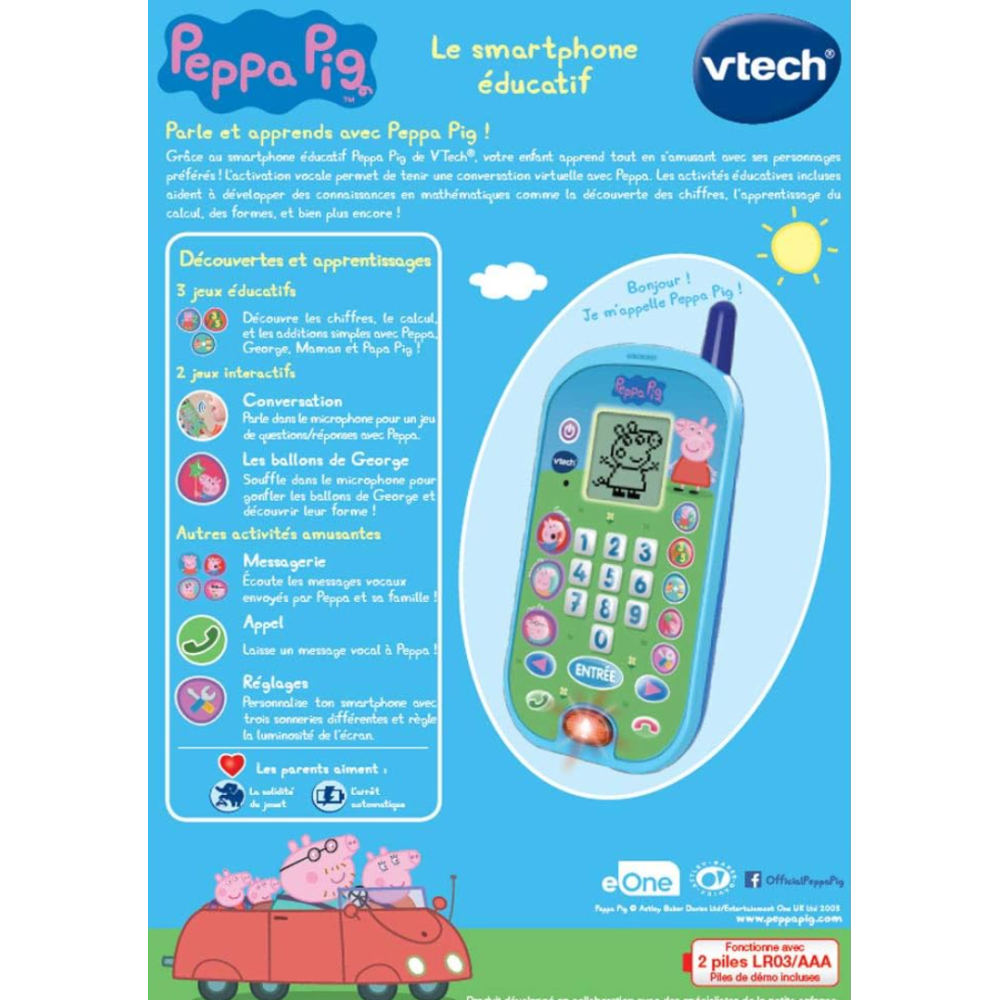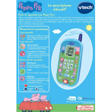 Le smartphone éducatif Peppa Pig pour les 2 à 5 ans - Contient 10 touches chiffres, 5 touches d'activités et 3 touches personnages pour apprendre tout en s'amusant - Emets des messages vocaux et des animations adaptées à chaque membre de la famille - Ecran LCD - Possibilité de personnaliser jusqu'à 3 sonneries - Dispose de sons amusants et voix originales de la série Peppa Pig - Arrêt automatique - Fonctionne avec 2 piles LR03 - Dimensions de l'article L2 x l8 x h17 cm.