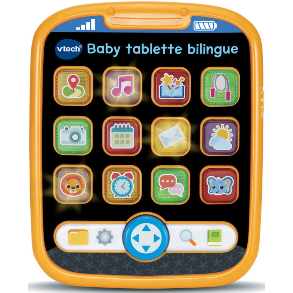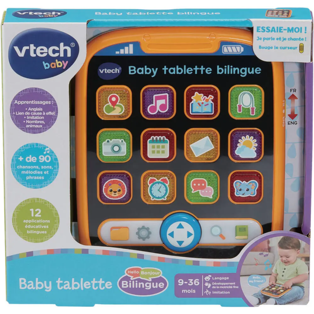 Tablette bilingue Vtech Baby conçu pour les enfants de 9 à 36 mois - Offre une expérience captivante qui stimule la curiosité des tout-petits tout en les initiant de manière ludique à deux langues à deux langues - Dotée de fonctionnalités attrayantes - Permet aux enfants de développer leur vocabulaire et leur compréhension linguistique en jouant - Contient des boutons tactiles pour offrir une manipulation aisée et intuitive - Jouet unisexe - Design sécurisé et robuste - Compagnon parfait pour accompagner votre enfant dans ses premières découvertes linguistiques - Fonctionne avec 2 piles LR03 - Recommandé dès l'âge de 9 mois.