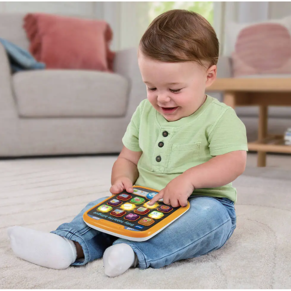 Tablette bilingue passant du français à l’anglais en appuyant un bouton - Propose 3 niveaux de jeu interactifs et divertissants pour défier les petits esprits curieux - Dimensions de la tablette : 18 cm de long, 2 cm de large et 13 cm de haut - Dispose de 12 boutons interactifs et plus de 205 chansons, mélodies, phrases et sons pour une expérience de jeu riche et sensationnelle - Permet à l’enfant d’explorer les couleurs, découvrir les sons et comprendre son environnement tout en jouant - Idéal pour les petits dès l’âge de 18 mois.