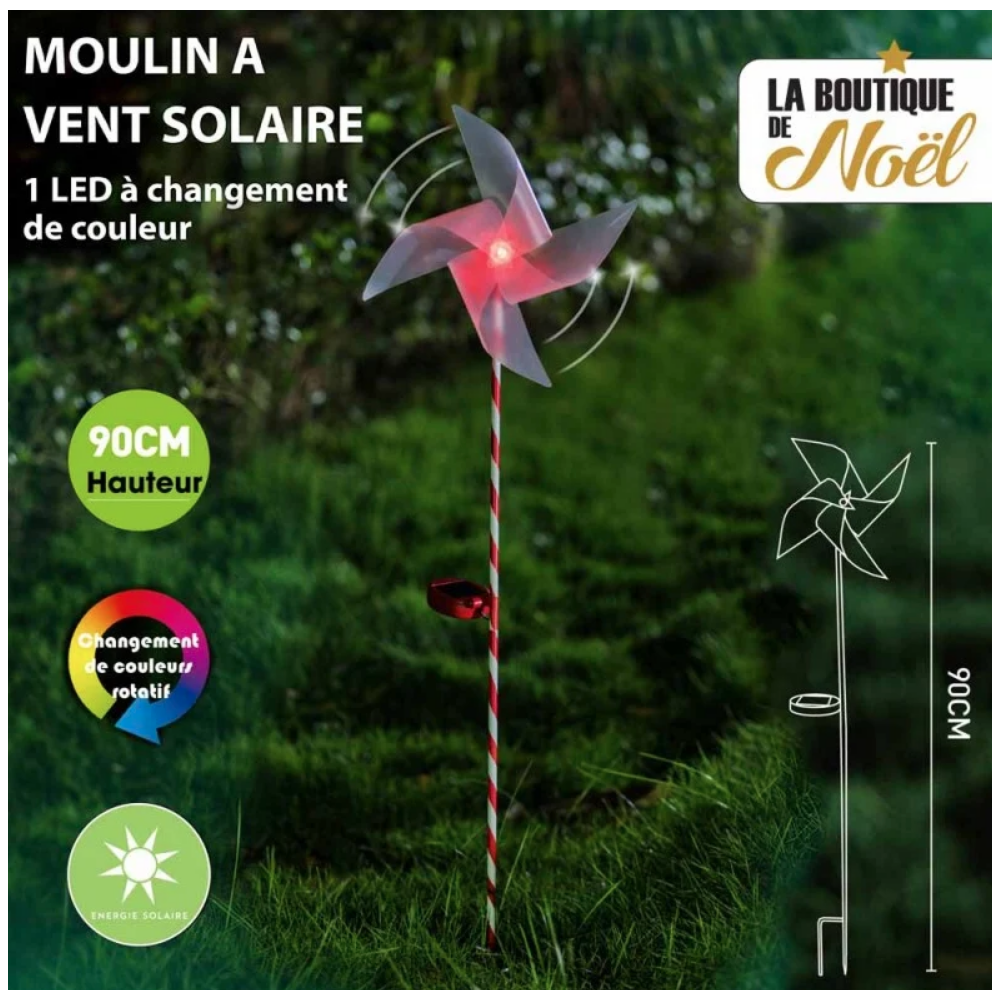 Moulin à vent lumineux - led solaire. Ce moulin à vent lumineux s'installe en extérieur, dans votre jardin ou encore dans une jardinière de votre balcon. Facile à utiliser, il vous suffit de planter ce moulin à vent solaire dans la terre, de préférence dans un endroit ensoleillé. Grâce à son énergie solaire stocké, le moulin à vent tournera et s'éclairera de multiples couleurs lumineuses une fois la nuit venue.