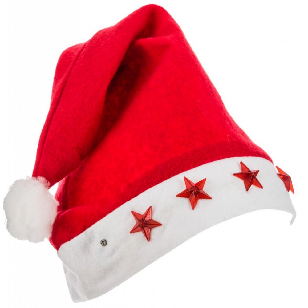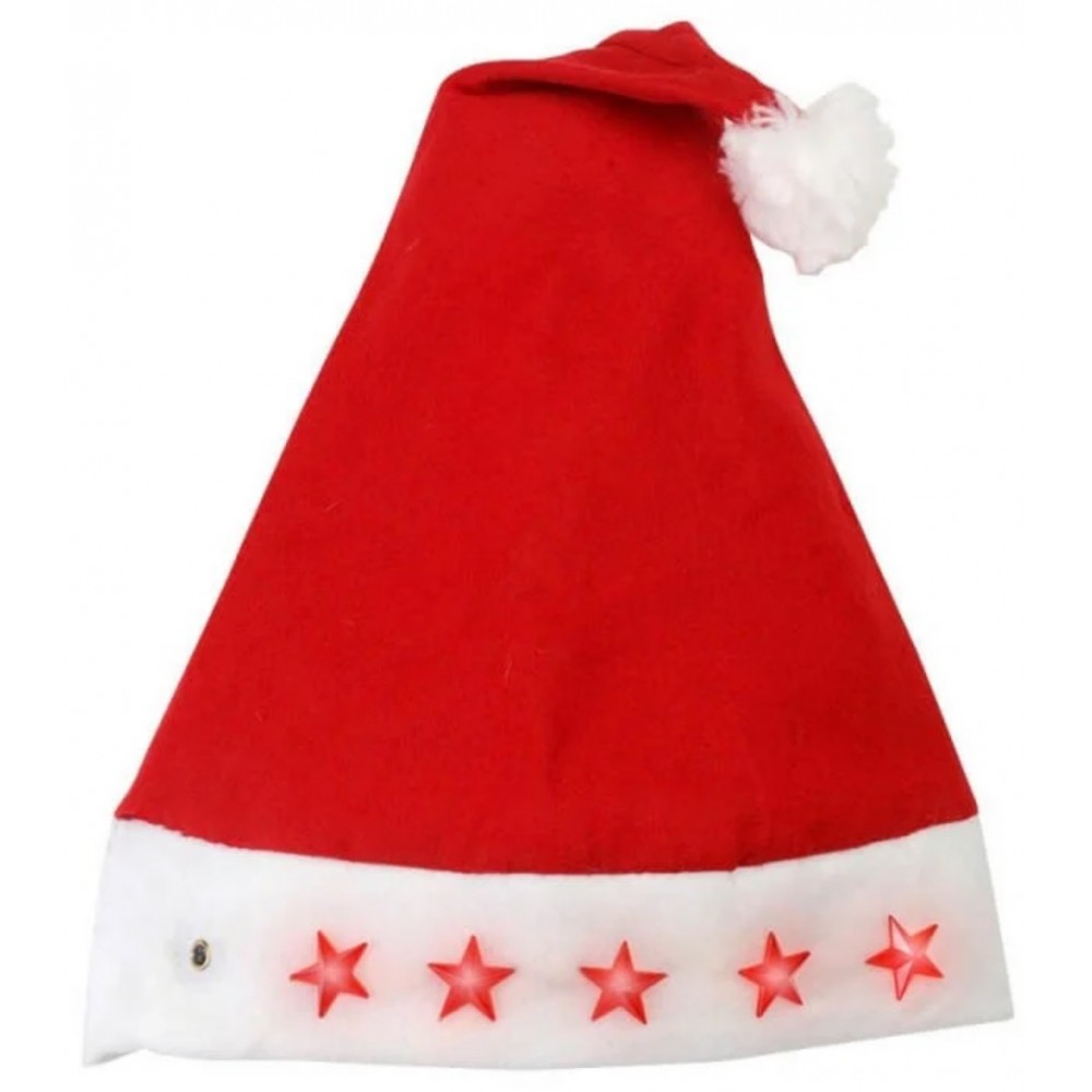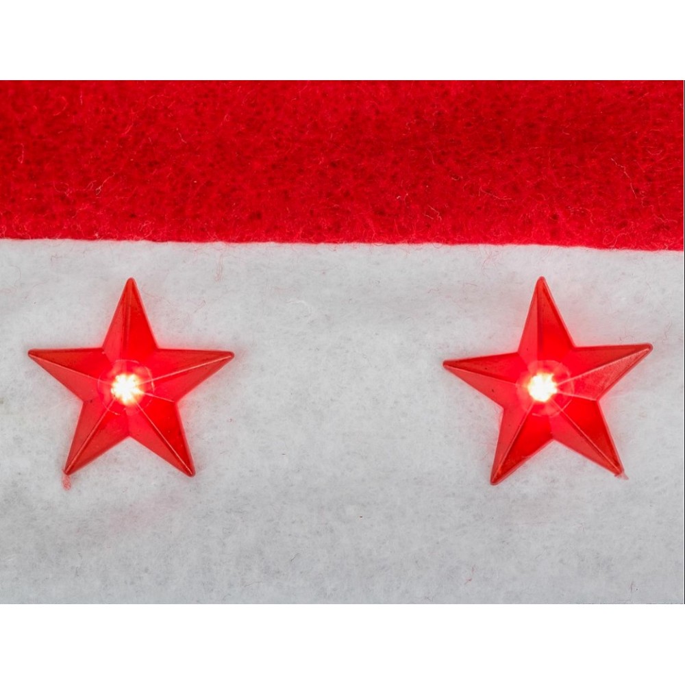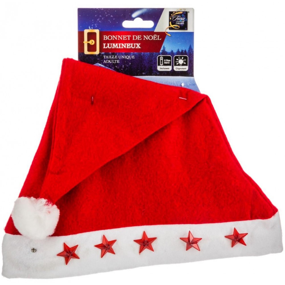 Bonnet de père noël lumineux avec étoiles clignotantes. Epatez vos amis et votre famille avec ce bonnet de père noël lumineux et ses étoiles clignotantes. Plein de charme, ce bonnet traditionnel en feutrine enchantera vos fêtes de fin d'année et vous permettra de faire de superbes photos de famille. Informations techniques. Dimensions : hauteur : 41 cm, diamètre : 29 cm. Accessoires : interrupteur on/off et boitier à piles. 2 piles bouton fournies. Coloris : rouge et blanc.