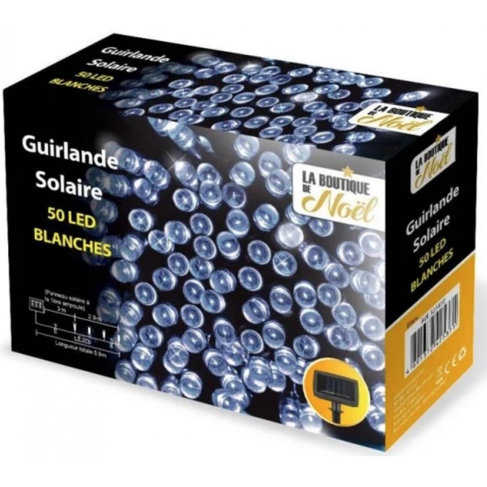 Guirlande solaire 500 led blanche. Dimensions totales : l. 31,9 m. Entre 1ère et dernière led : l. 29,9 m. Entre chaque led : 6 cm. Poids : 620 g environ. Éclairage : 500 led. Couleur : blanc.