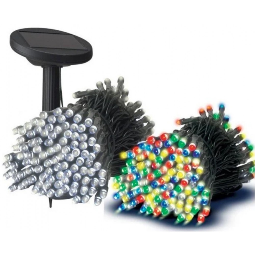 Guirlande solaire 100 led multicolore. Dimensions totales : l. 9,9 m. Entre 1ère et dernière led : l. 6,9 m. Entre chaque led : 7 cm. Poids : 220 g environ. Éclairage : 100 led. Couleur : multicolore.