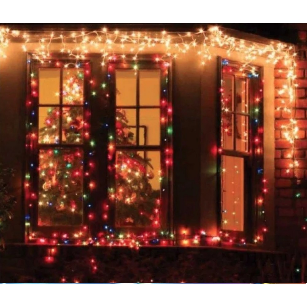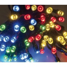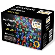 Guirlande solaire 500 led multicolore. Dimensions totales : l. 31,9 m - entre 1ère et dernière led : l. 29,9 m - entre chaque led : 6 cm. Poids : 620 g environ. Éclairage : 500 led. Couleur : multicolore.